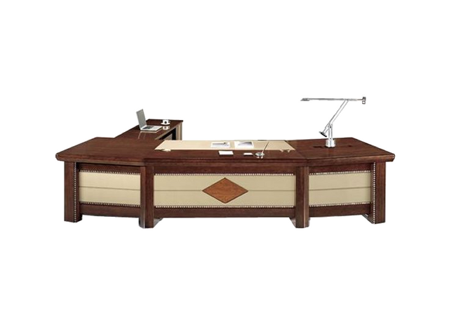 Introducing the UTB323 executive office desk. Made from the finest materials and made to the highest specification that the Sandhurst range offers. This executive office desk is supplied with a choice of three real wood veneers. Either veneer comes with unique and stylish cream leather panelling on the modest panel. Which is stretched throughout the full curve. The chunky desktop also has a cream leather writing pad integrated; in addition to this, the desktop also has two large cable management. This model is supplied with a three-drawer pedestal and side return. These are supplied by castors and can be positioned in any position you'd like.