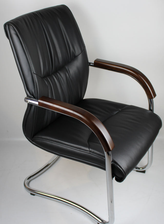 The 6161 meeting chair has a very modern design, making it ideal for a reception area or a meeting room environments. This model features a heavy duty chrome frame, ideally for prolonged usage, and a black leather finish, which contrasts well with the wooden walnut arm pad.