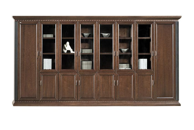 The bookcase features two full-height wooden doors on the far left and right sides of the bookcase. The central sections are made up of a lower section with a total of six compartments covered by wooden doors with the upper section featuring six wooden doors with glass inserts. Each compartment is fitted with height-adjustable shelving for flexible and convenient storage.