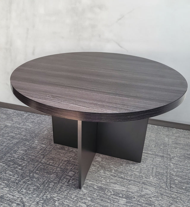 The LX-B02-1200 is a round meeting table with an arrowhead leg design. This meeting table has been finished in our high-quality grey oak melamine.