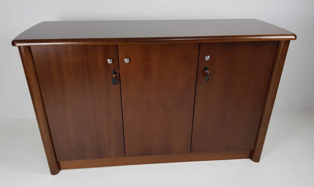 Three-door office cupboard sold with a matching colour to our Light walnut Executive Range. One single door and one set of twin doors both with locking capabilities, are ideal for storing confidential files.