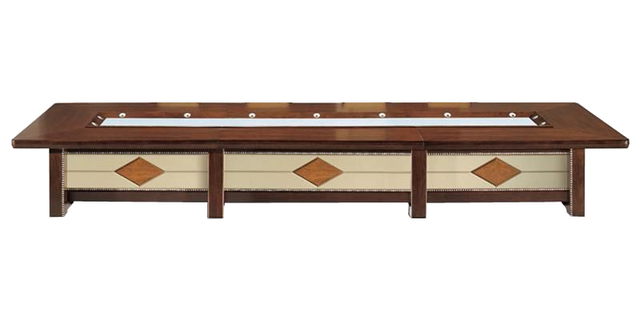 The MET-UT3B48 executive meeting room table is a premium piece of furniture. A truly unique, one-of-a-kind piece that can fit into nearly all environments. High-end real wood veneer; either walnut, cherry or black ash is available. Either veneer option comes with stylish cream leather panelling with fancy trims. The desktop is very thick and has plenty of cable management holes integrated through the plinth in the middle of the table.