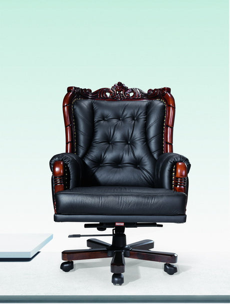 Genuine Black Leather Luxury Traditional Office Chair with Walnut Detailing - CHA-A288