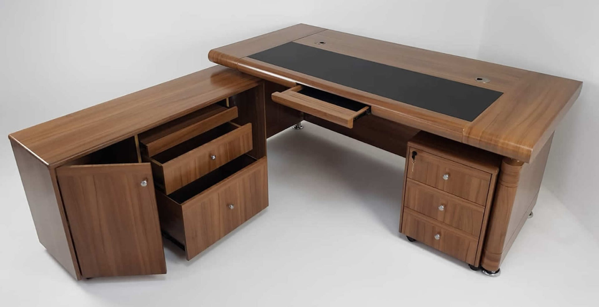 - Features: Cabinet, Cable Management, Castors, Desk, Display Cupboard, Double Door, Drawers, Includes Pedestal, Includes Return, Internal Drawers, Keyboard Tray, Modesty Panels, Premium, Wooden