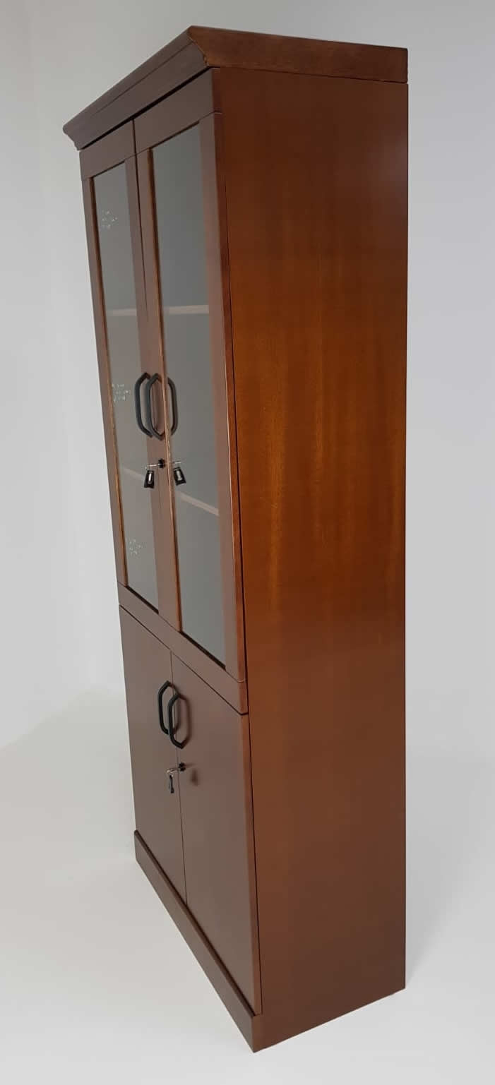 Executive two door bookcase which consists of two glass doors and door solid wood doors. Each section contains a locking mechanism which is supplied with two keys per lock.