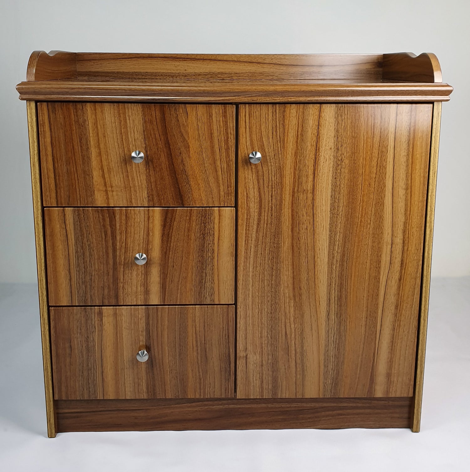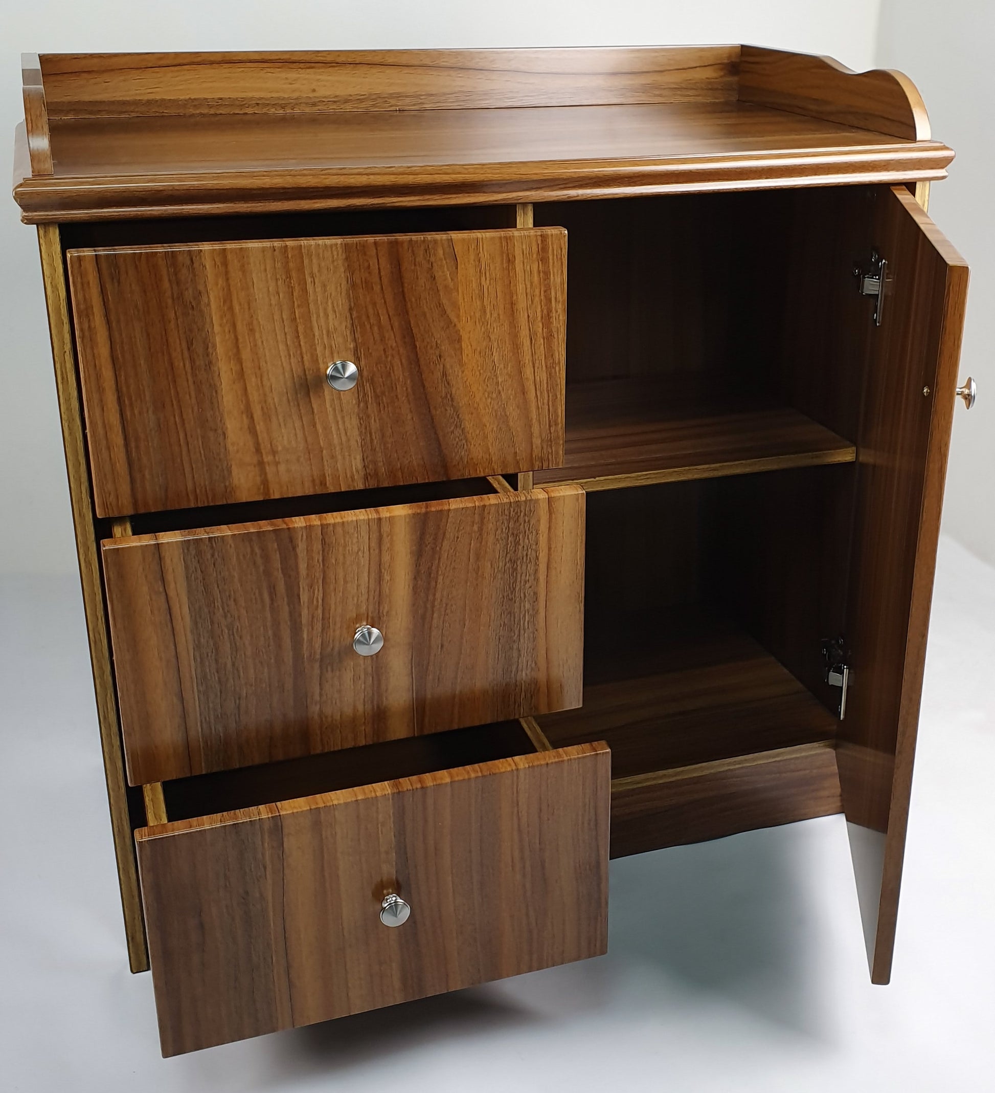 This cupboard comes with three pull out drawers, and in addition to this, one wooden door with a fixed shelf behind it.
