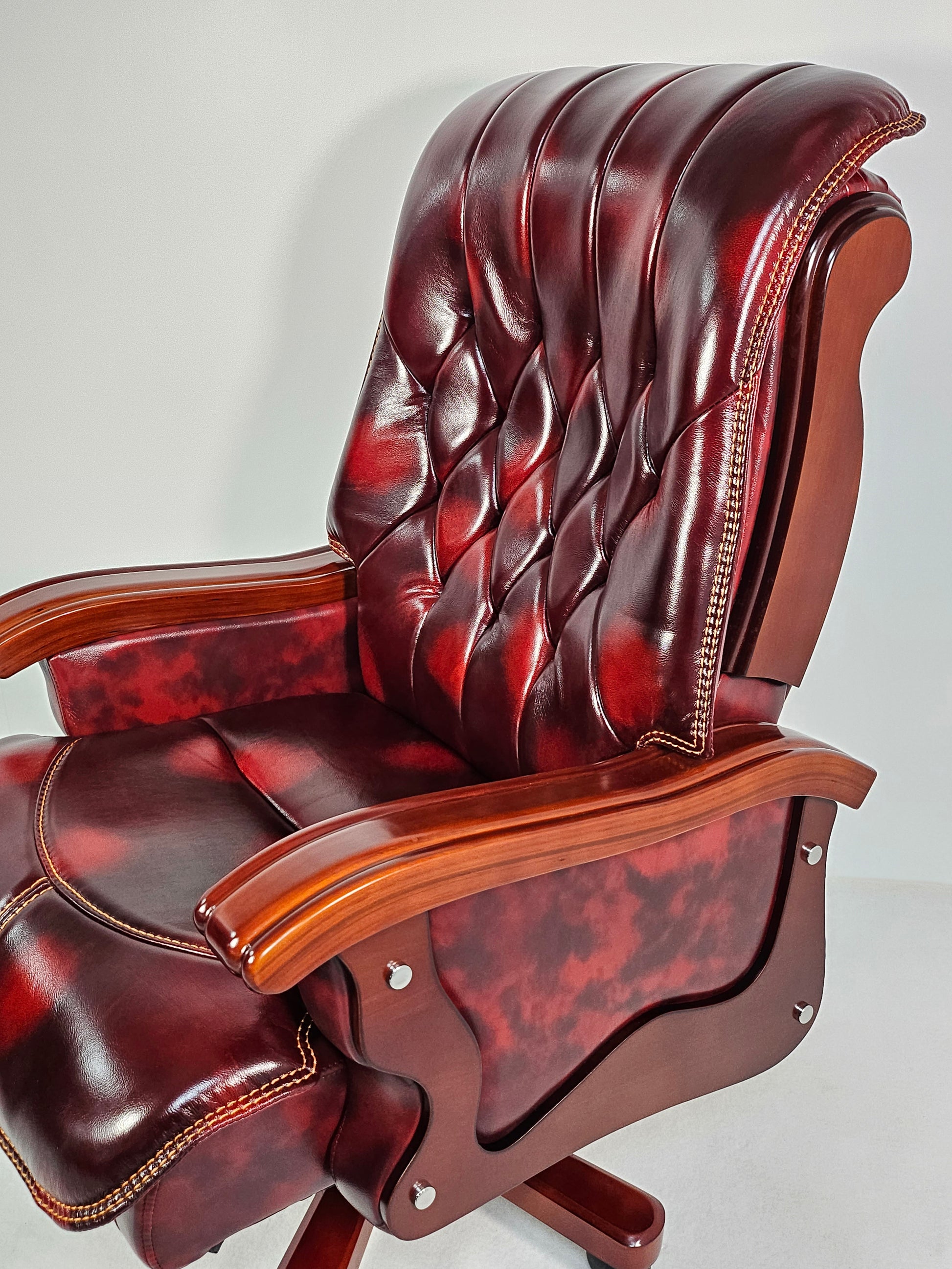 Large Burgundy Genuine Leather Executive Office Chair with Walnut Detailing - A8052