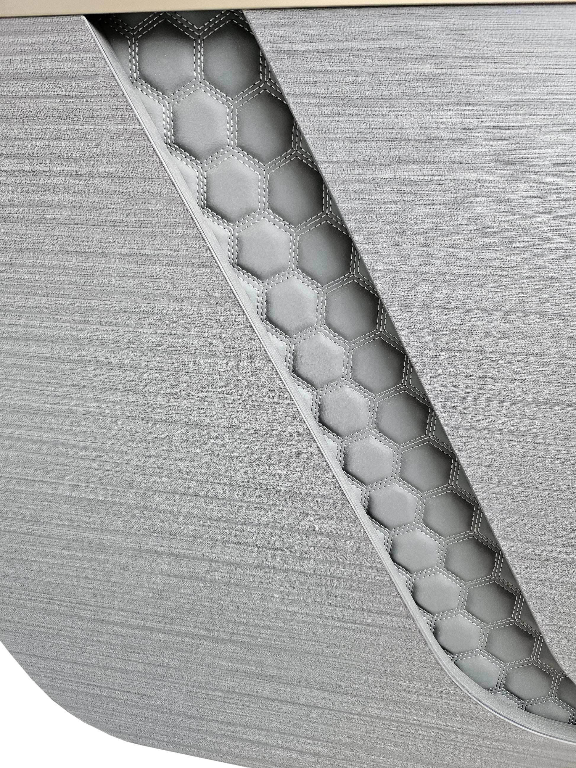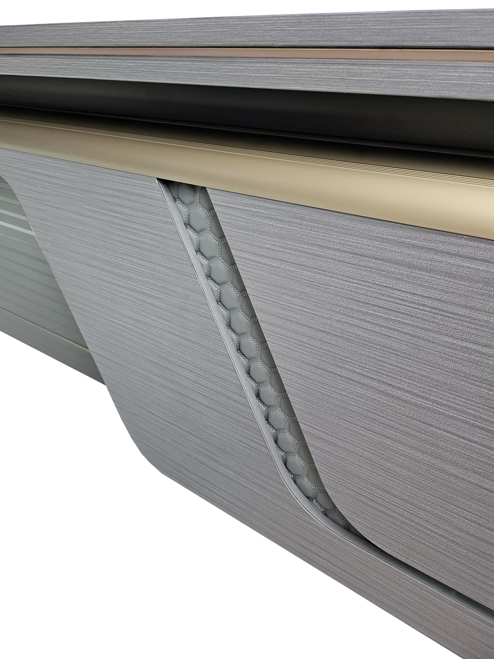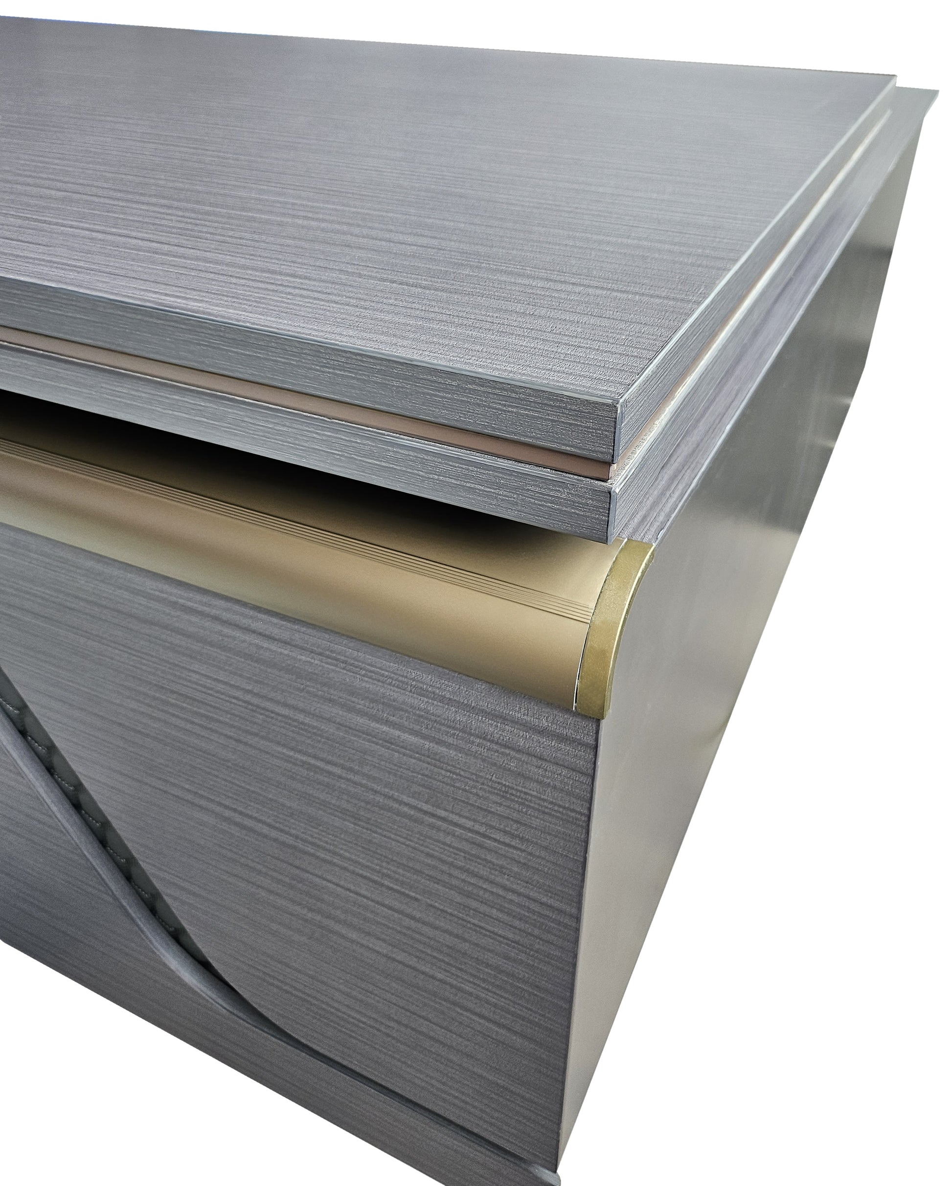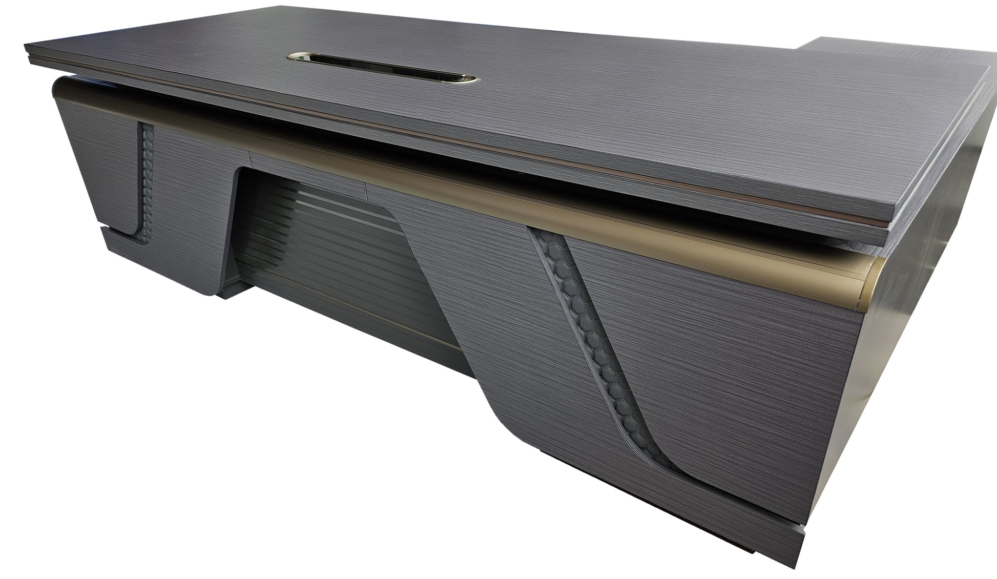 A full-length desktop provides an expansive working surface, allowing productivity to be maximised with ease. The modesty panel features a modern layered design, finished in matching grey oak and enhanced with a grey leather inset concealed behind the panelling. A curved brass-finished metal strip sits atop the modesty panel, adding a distinctive design detail that reinforces the desk’s modern appeal.