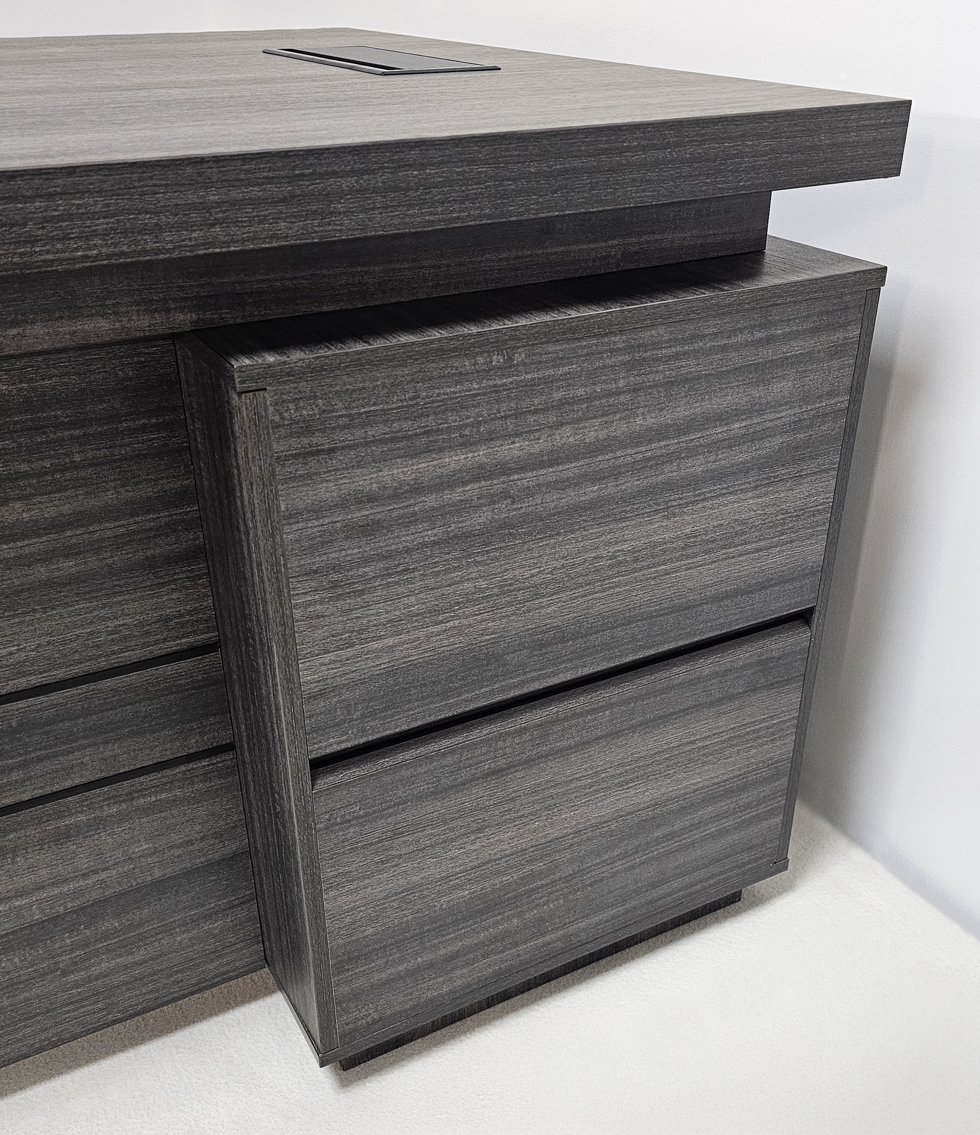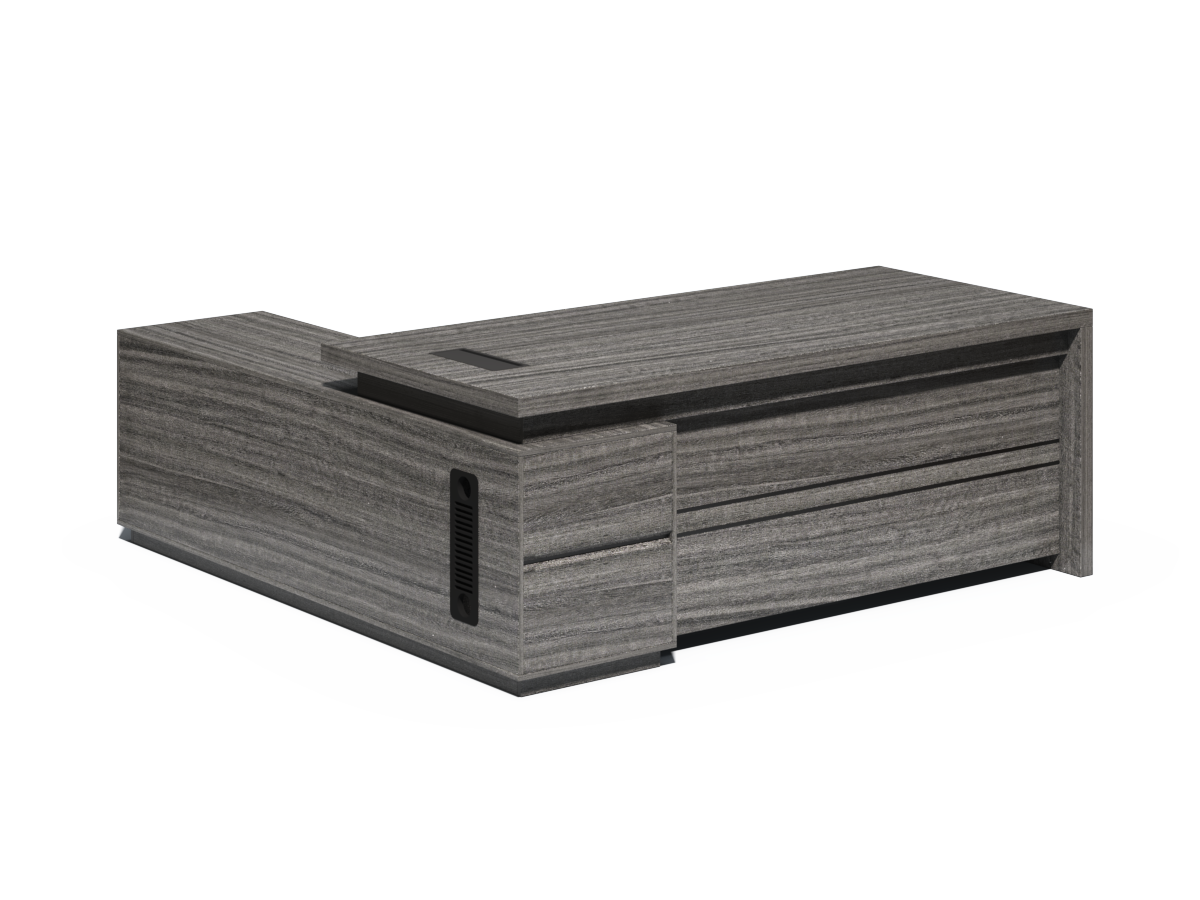 The CF-CRN-H is a high-quality executive office desk, finished in our grey oak melamine. The melamine on this desk has quality features such as being anti-scratch, heat resistant and hard-wearing. The desktop has been manufactured at 50mm thick, which is double the thickness of standard 25mm desktops.