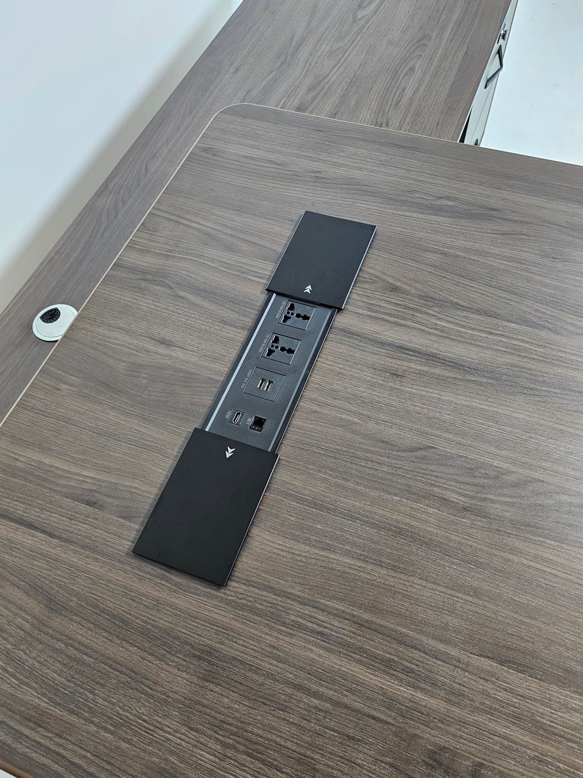 The H05 office desk is 2200mm wide. This has been finished in a stylish coffee oak melamine with contrasting cream-coloured panelling. The desktop features a modern powered unit built in. This unit includes two plugs (UK PLUG COMPATIBLE), 2 USB A ports, an HDMI port and an RJ45 Ethernet port.
