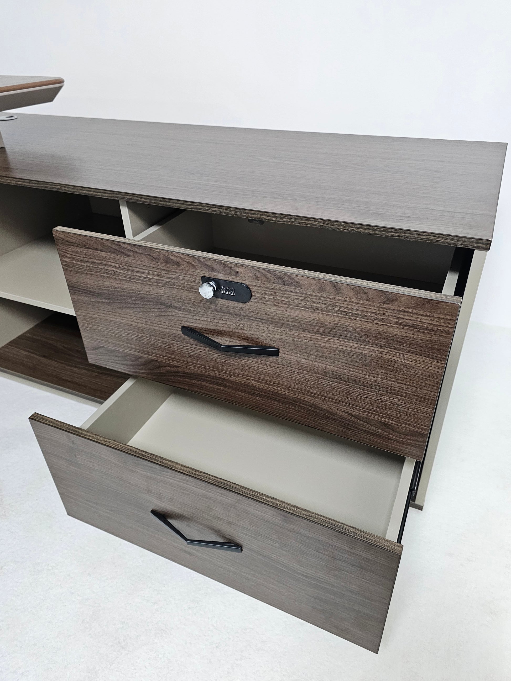 This desk has a corner design, which can be assembled on either side. The side return on this model features; Two Large Drawers, Open Shelving and a large CPU Tower section. (Please note that only the top drawer is lockable)