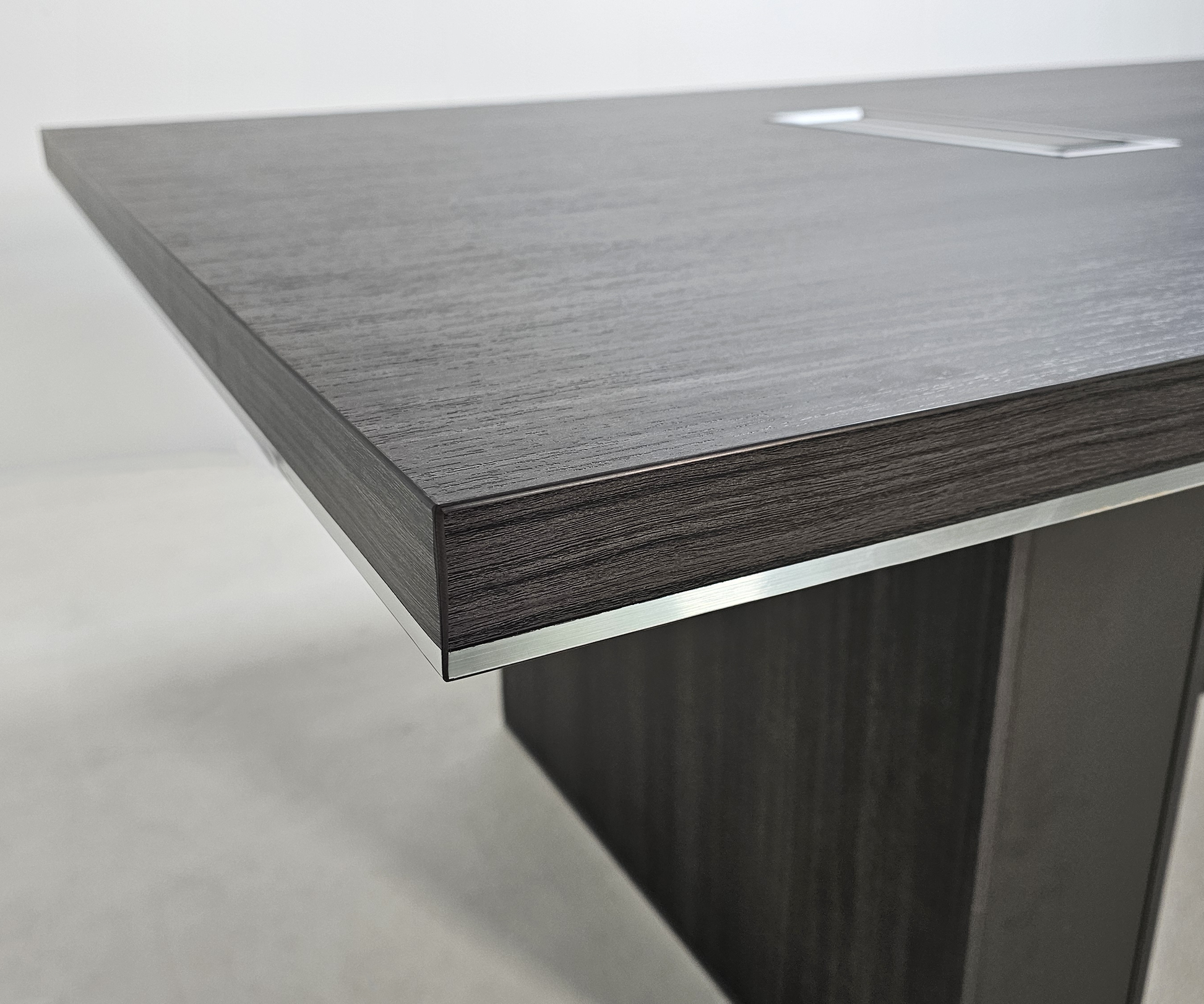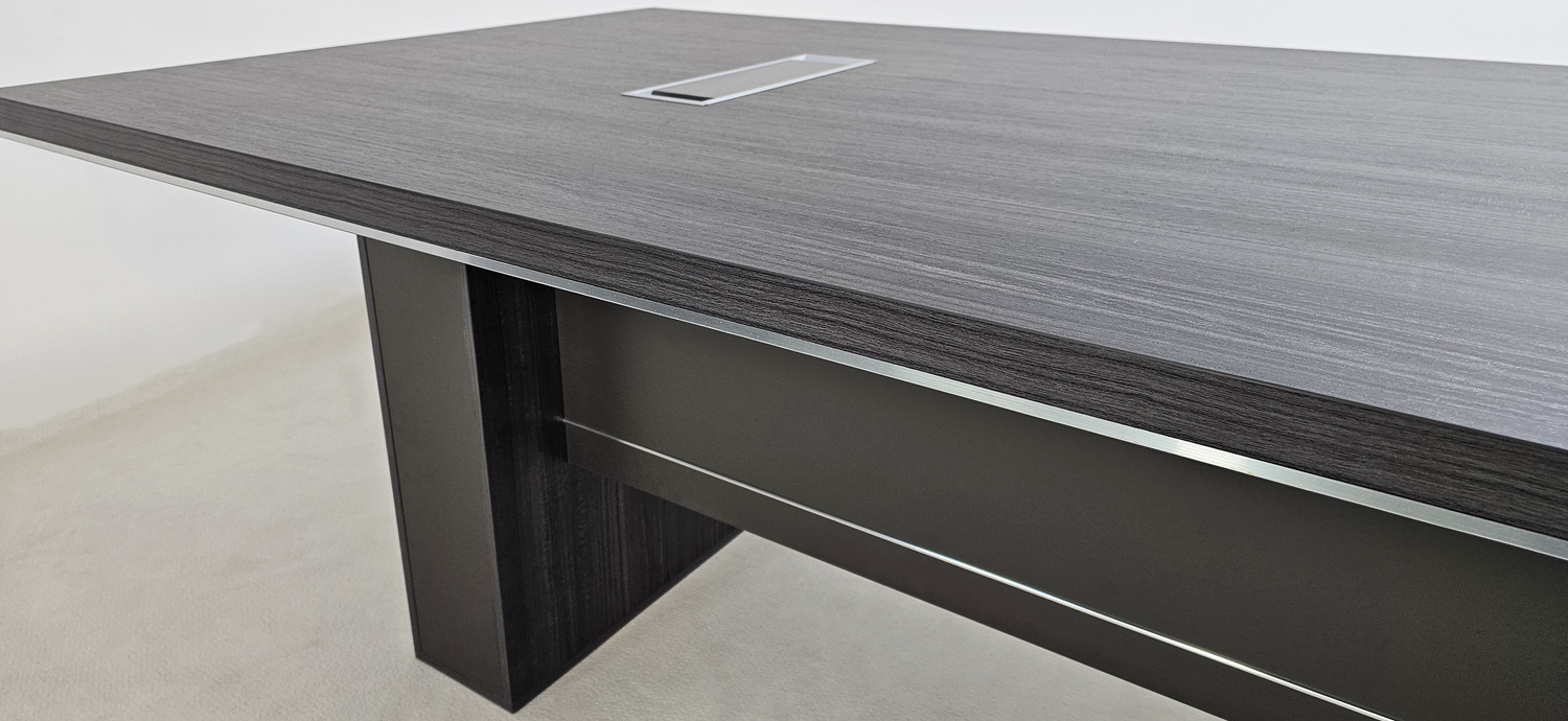 The DG07-C0124 executive boardroom table has our premium Grey Oak veneer Melamine throughout. The desktop has been made 50mm thick, double the standard thickness of melamine furniture. This also has a modern chrome edging, which runs around edging. This sits atop a sturdy frame, with two solid chunky legs with two modesty panels interconnecting modesty panels. This makes the structure of this desk very strong and sturdy. This meeting table also benefits from a cable management system, which allows cables to be neatly organized and fed through the desktop.