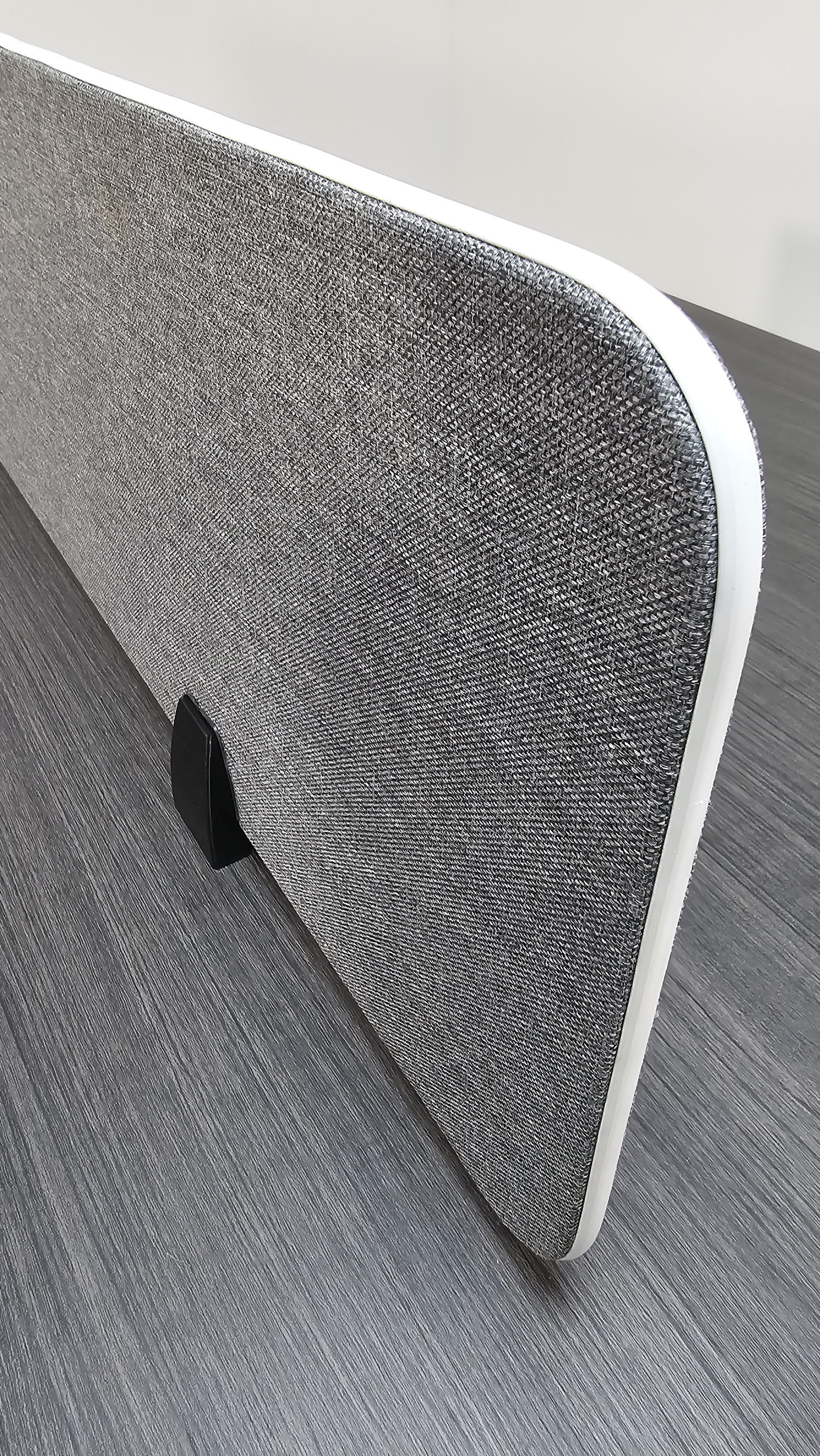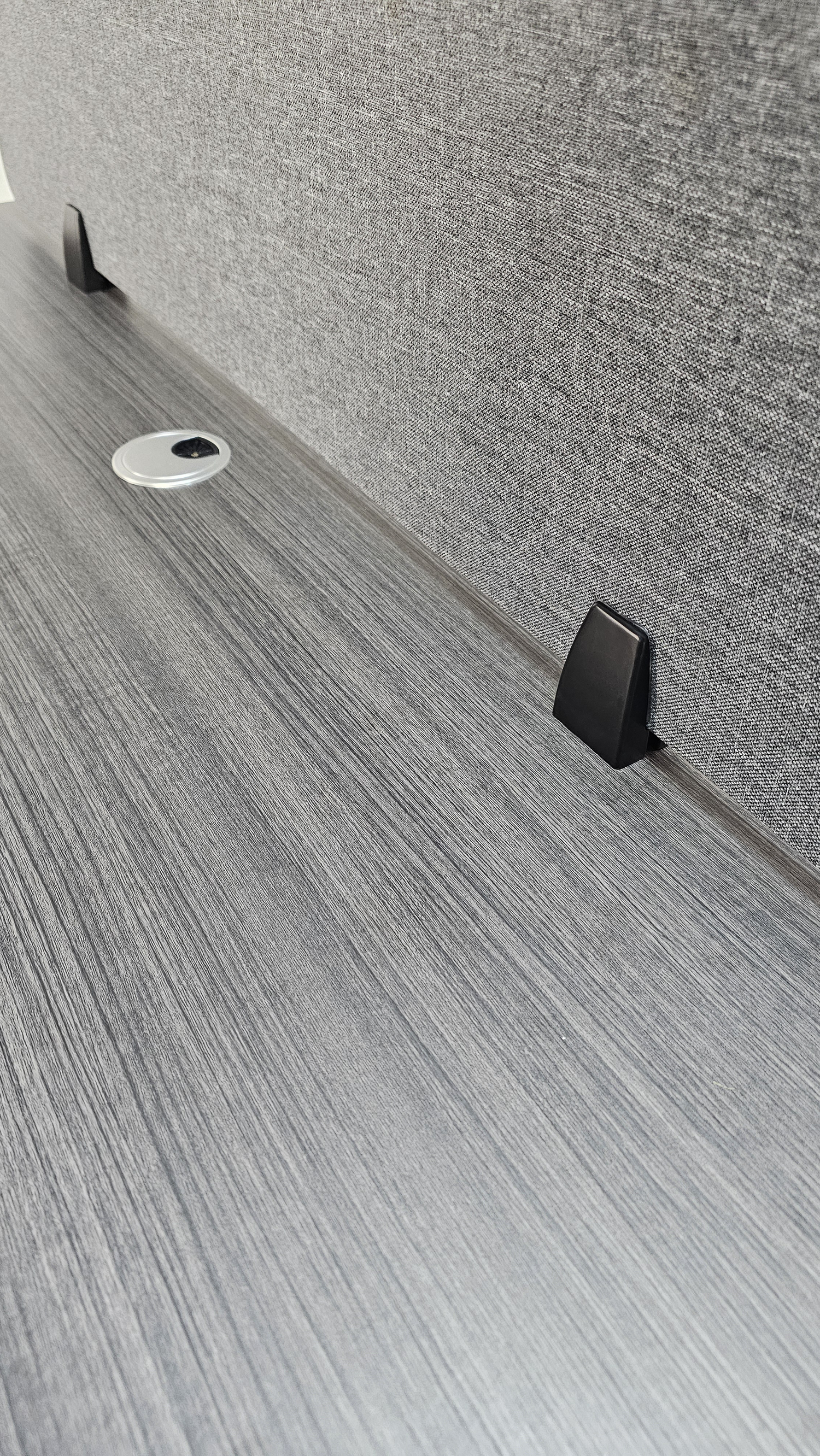 This desk has a divider panel with all the bracket fixings provided. This then separates the two users while they are working. Each desk has its cable management port pre-drilled.