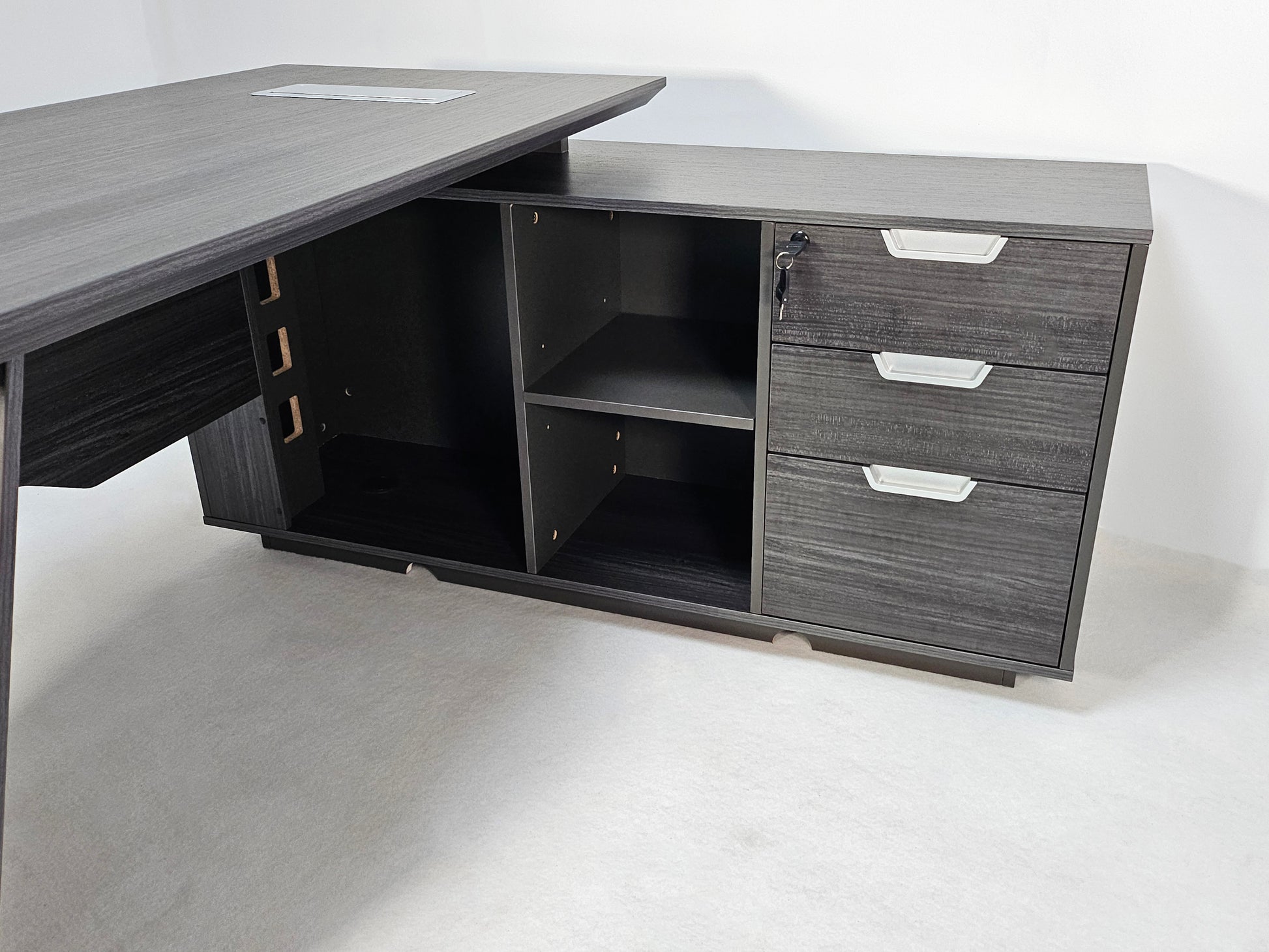 1) Fully integrated three-drawer pedestal, supplied with a set of keys and is fully lockable.