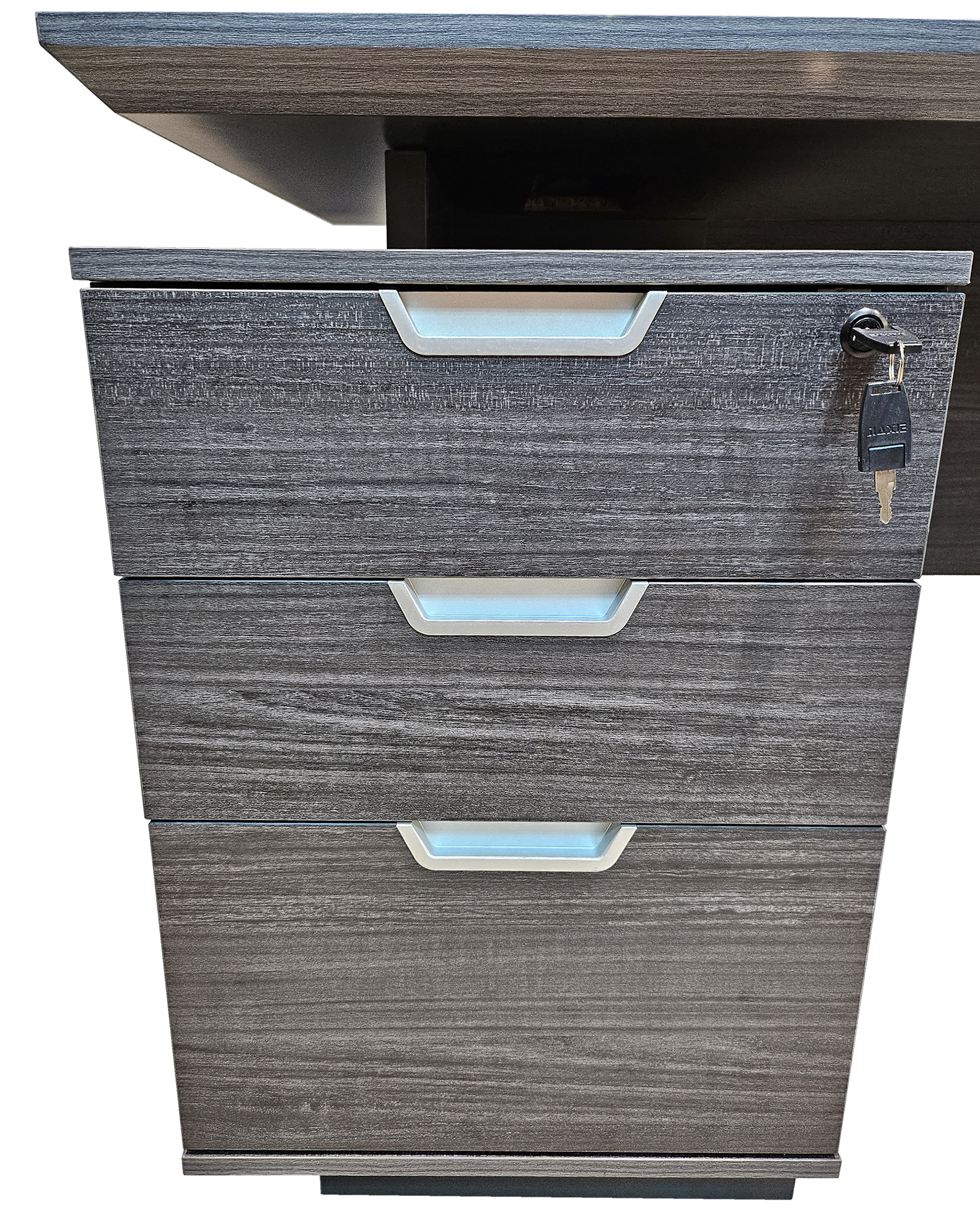 The desk features a full-length desktop, providing generous surface space to maximise productivity, and is enhanced by a refined bevelled edge detail that runs around the entire top. An integrated three-drawer pedestal is built into the design, offering secure storage and supplied complete with a locking mechanism and keys, allowing all drawers to be locked for added security. For added flexibility, the DG19-S-D20 can be assembled with the pedestal positioned on either the left or right-hand side, making it adaptable to a wide range of office layouts.