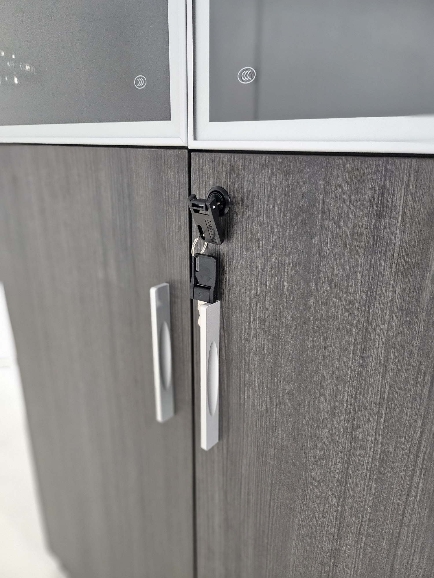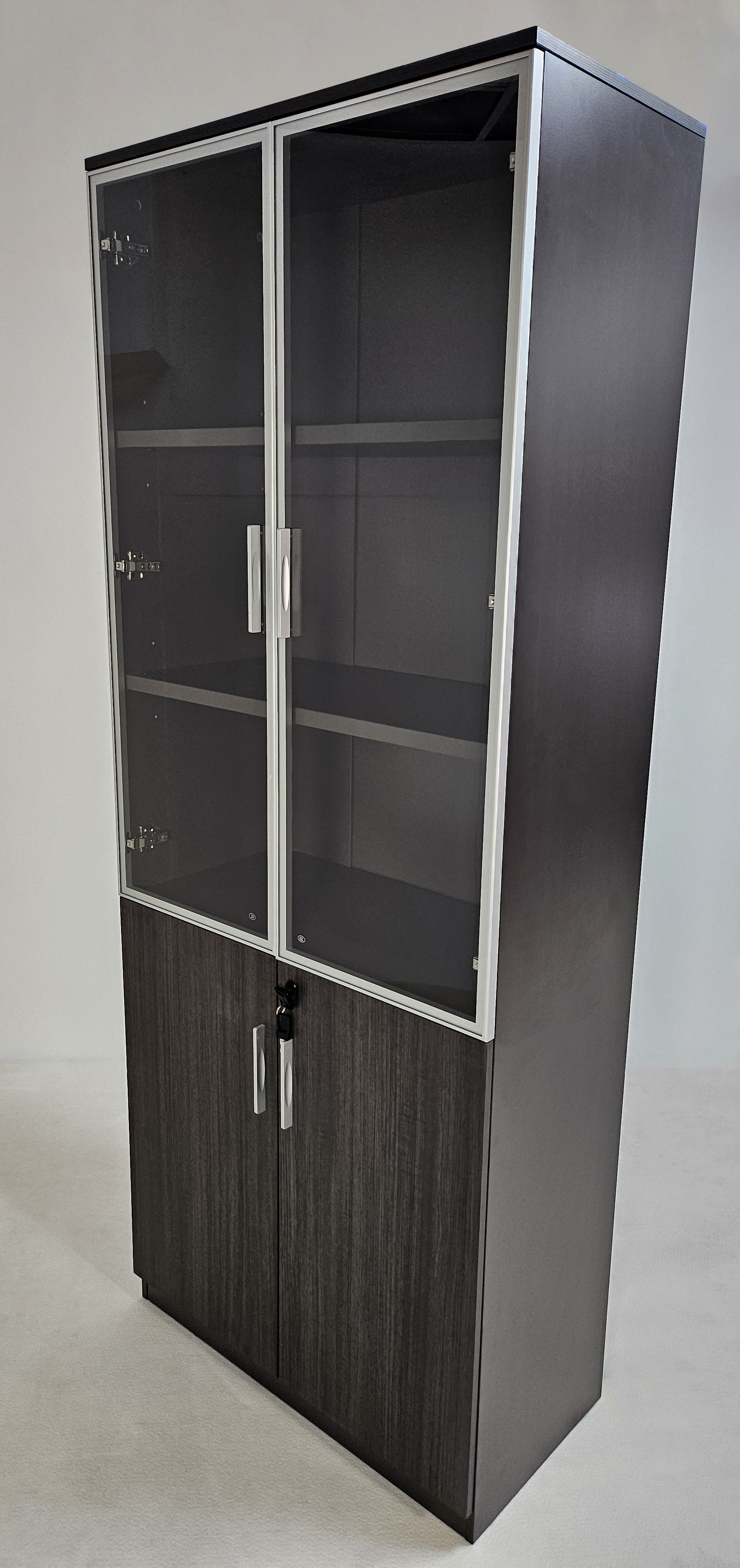 The DG25-S0408 is a stylish two-door bookcase finished in contemporary grey oak melamine. Measuring 800mm wide, it offers a practical combination of secure storage and display. The lower section features double doors in matching grey oak, complete with a lock for added security. The upper section is fitted with tempered glass doors framed in aluminium, ideal for showcasing books, files, or decorative items while maintaining a professional look.