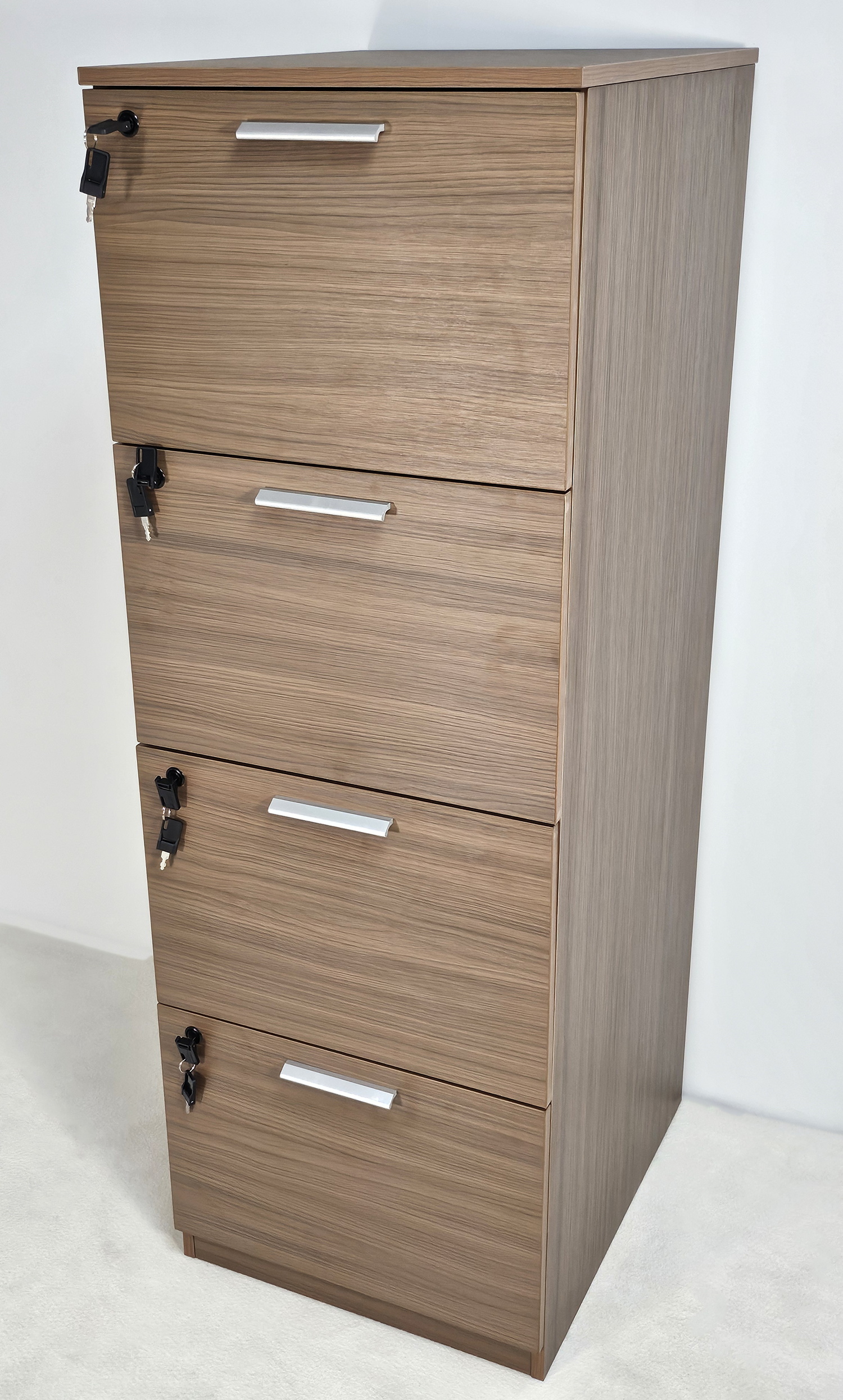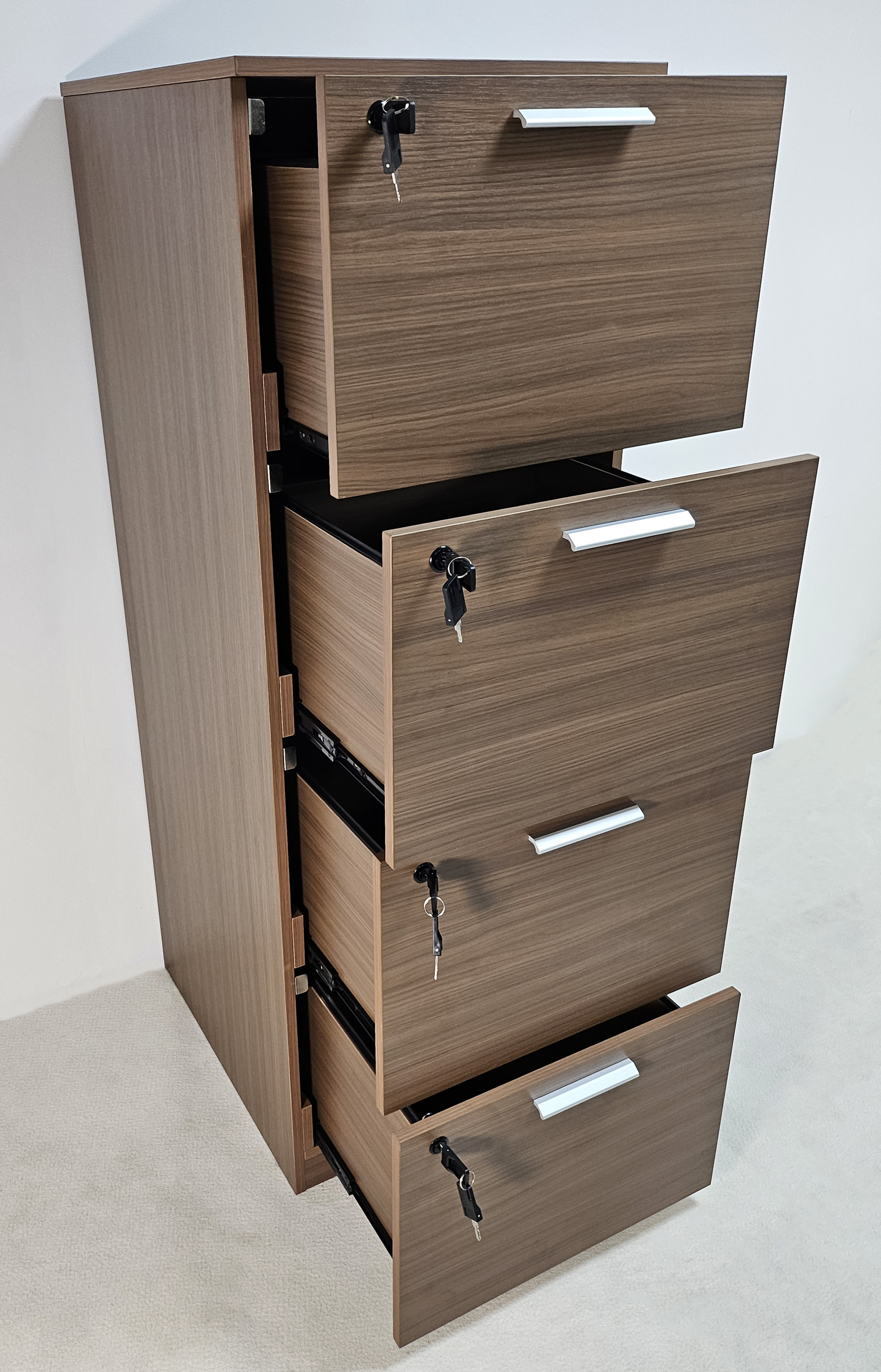 The DG27-AB84 filing cabinet is a durable and stylish storage solution, finished in premium American walnut melamine for a warm, professional look. Designed with functionality and security in mind, it features four individual locking drawers, each supplied with its own lock for added protection.