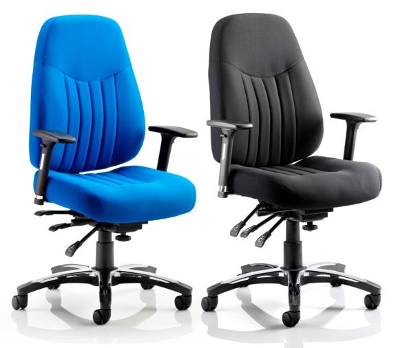This Deluxe chair is a heavy duty chair, meaning it has a long term life span and is built so its comfort and support levels stay for years. This chair has thick padded foam in the seat and backrest. This chair works on a three gas lever system, these control the height of the chair, the tilt on the back of the chair, and the seat slide, and on top of that, this chair has adjustable arms. This chair is perfect for anyone, who wants a ergonomic set up at home or at work. This chair is supported by a five star base made out of nylon and chrome which is why the usage time on this chair is twenty-four hours long. If in stock, this chair is available in two fabric colours, these are blue and black.