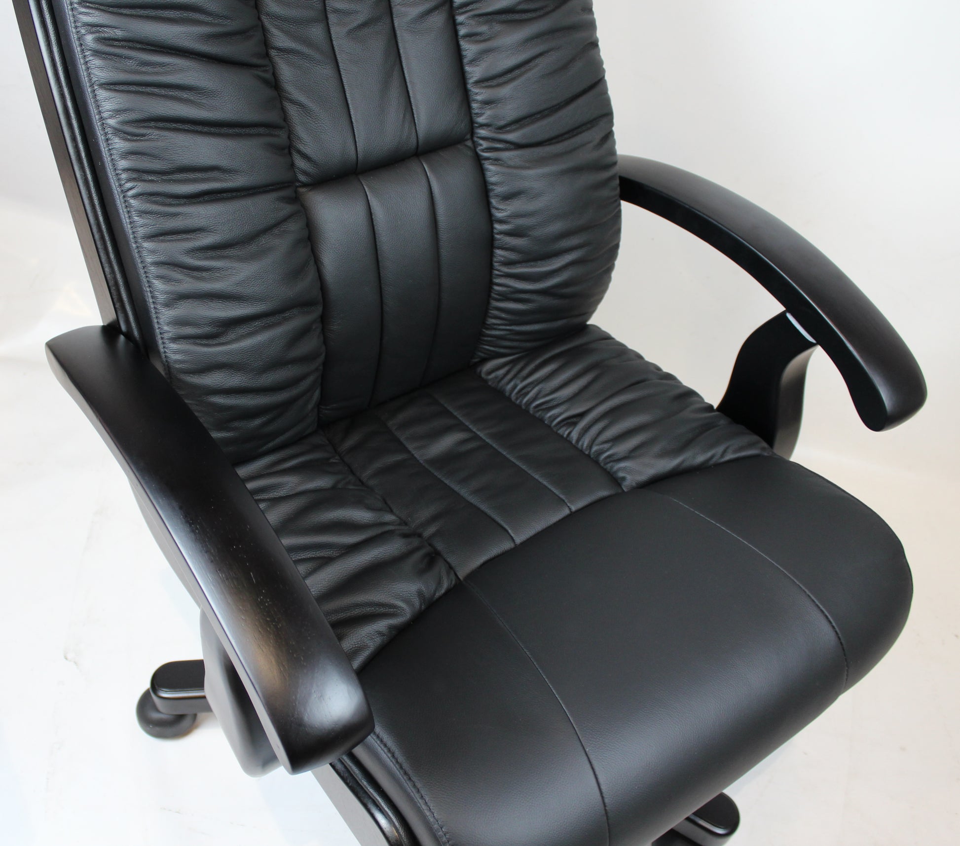 High-quality office chair with wooden arms finished in black. Genuine black leather upholstery. Traditional stitch design with waterfall seat. Protruded lumbar support to enhance posture and comfort. The mechanism on this chair features a seat height adjustment, tension control knob and tilt lock system.