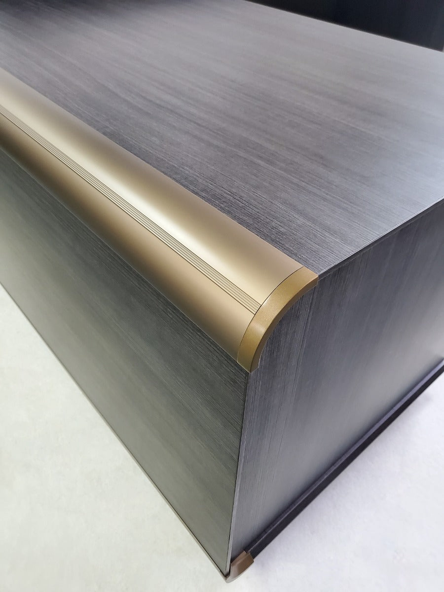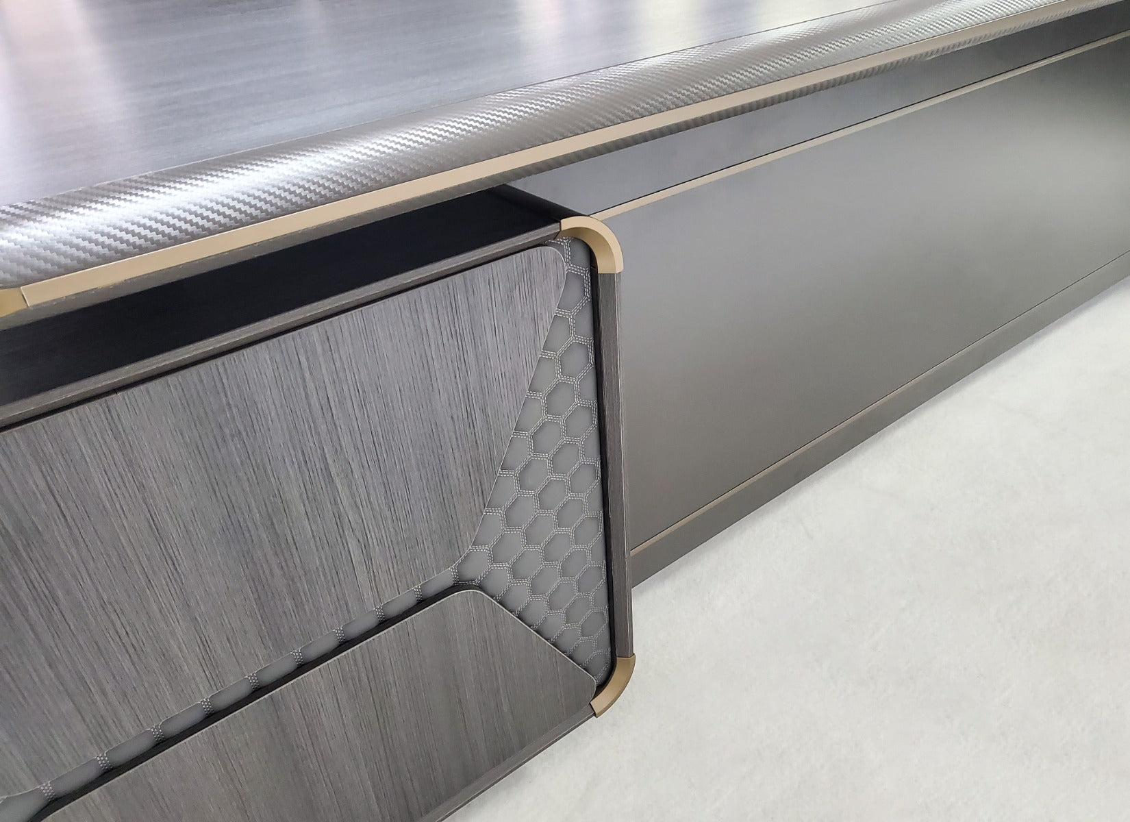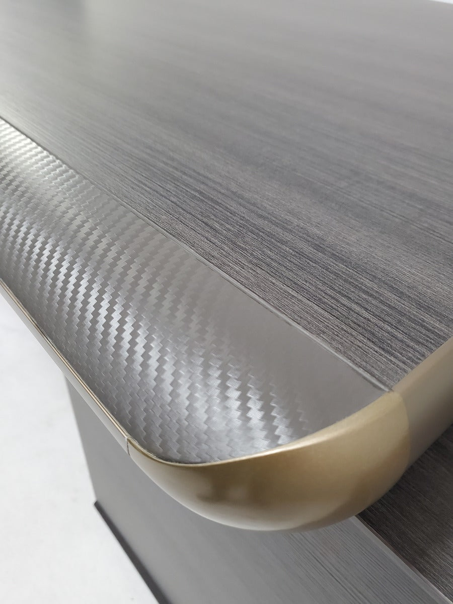 The FP60-D01 executive office desk is a striking example of contemporary design, offering one of the most modern aesthetics within the range. Finished throughout in refined grey oak melamine, the desk is enhanced by a distinctive carbon fibre effect desktop, delivering a bold and sophisticated visual contrast. Metal brass-effect edging frames the desktop, side return, and cupboard, reinforcing the desk’s premium, design-led appeal.