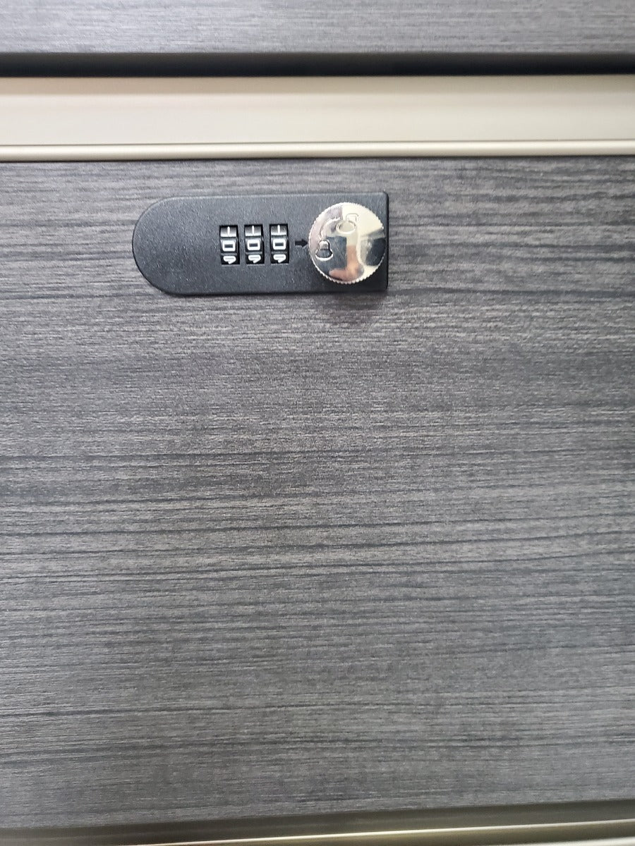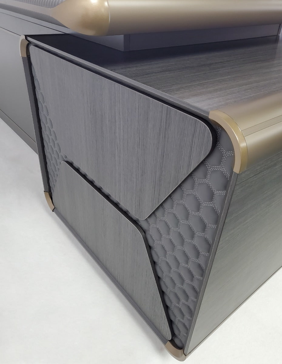 The modern theme continues across the front elevation, where inlaid grey leather panels are paired with contrasting brass accent strips throughout the modesty panel, creating a strong executive presence. Supplied as a complete workstation, the desk includes a generously sized side return and an integrated cupboard. The side return features a concealed cupboard, an open shelf, and two drawers, with the top drawer secured by a three-digit combination pin lock. Completing the side return is a large CPU hutch designed to accommodate a PC tower, incorporating integrated cable management that allows wiring to be neatly routed directly to the desktop. The cupboard is fitted with a full-height door with soft-close hinges, providing discreet and refined storage to complete this premium executive desk configuration.