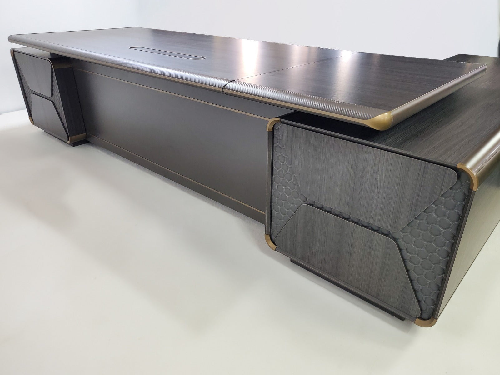 Large Modern Grey Oak Executive Corner Office Desk with Carbon Fibre and Brass Metal Edging - 2400mm / 2800mm / 3200mm - FP60-D01