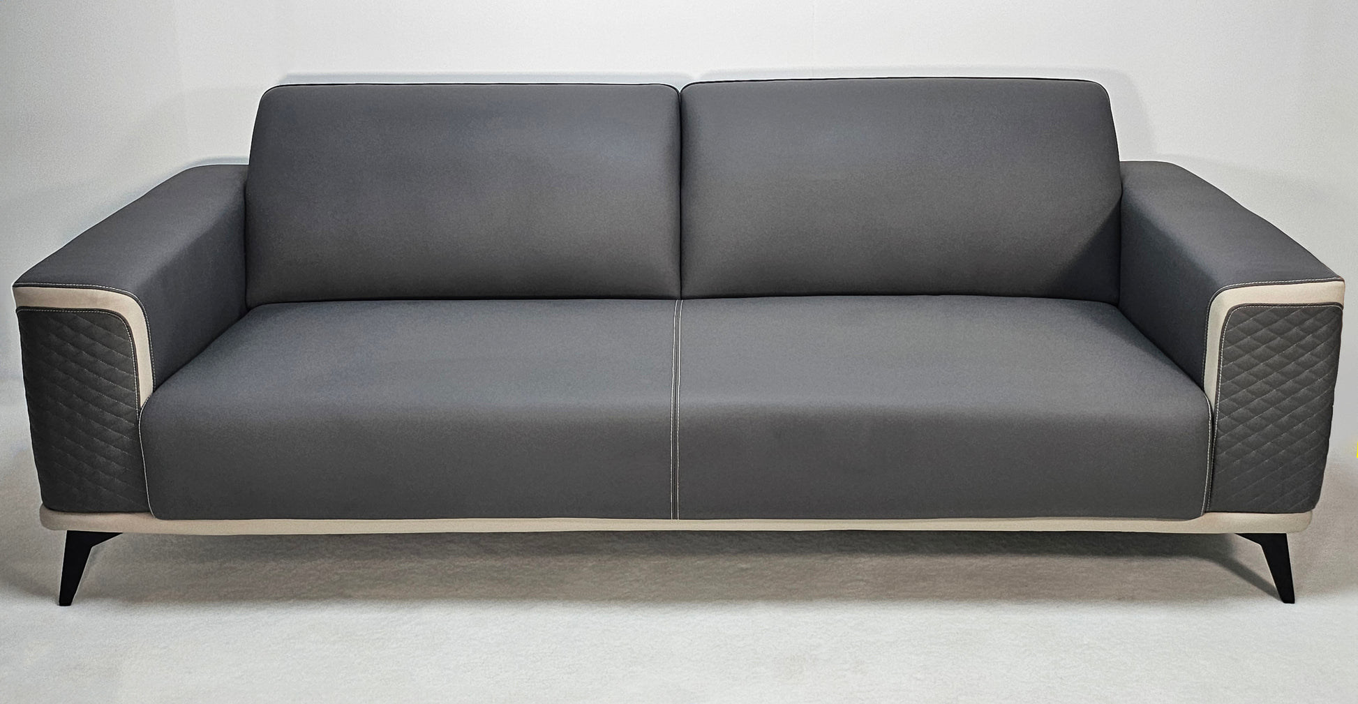 The latest in the Modern sofa range that we offer, is perfect for any environment. The JF119 is a Grey leather sofa with contrasting cream leather trim styling. This model features the modern diagonal stitch design which is found on the arms and back of the sofa. This sofa has soft foam padding on the seat and back, providing a comfortable experience for the user.