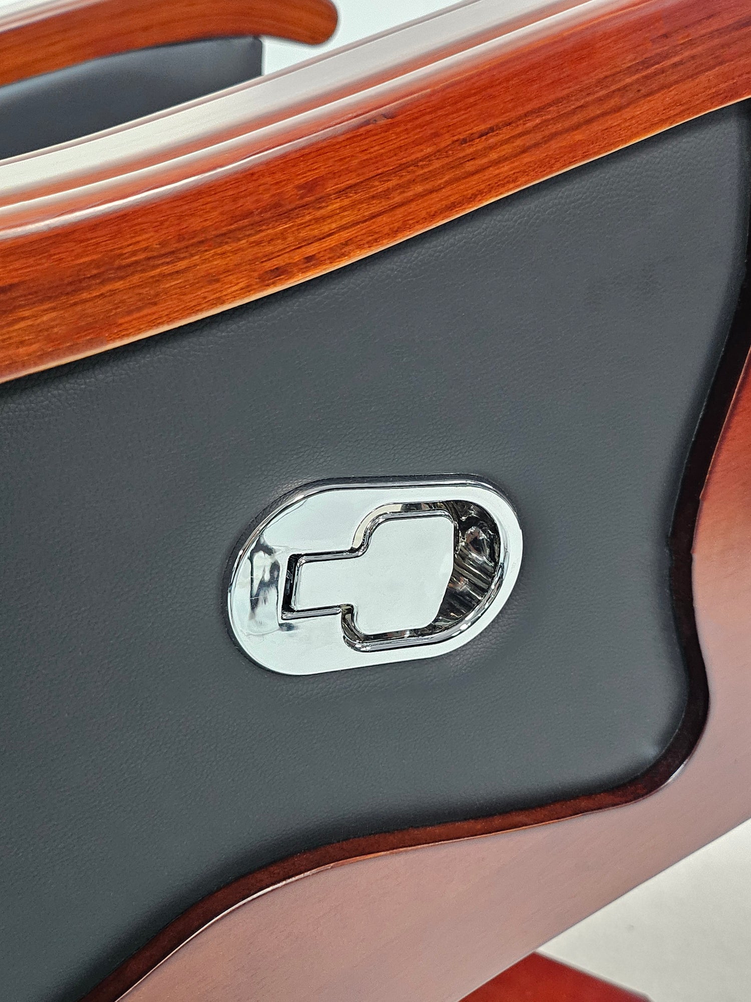 The A8052 office chair has a Black genuine leather upholstery. This chair has following a traditional theme, with hand-carved arms and wood panelling. All wooden parts have been finished in a walnut real wood veneer. The A8052 has soft padding in the seat and back, which gives the user a comfortable, one-of-a-kind experience. This chair has integrated recline features which can be operated with the chrome handle, located in the arm. This chair uses a heavy-duty gas lift and mechanism, which features; Seat Height Adjustment and a Tilt Lock.