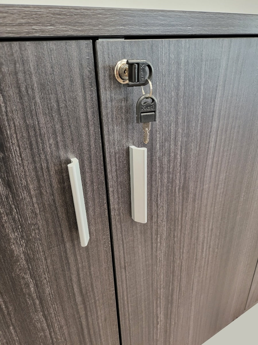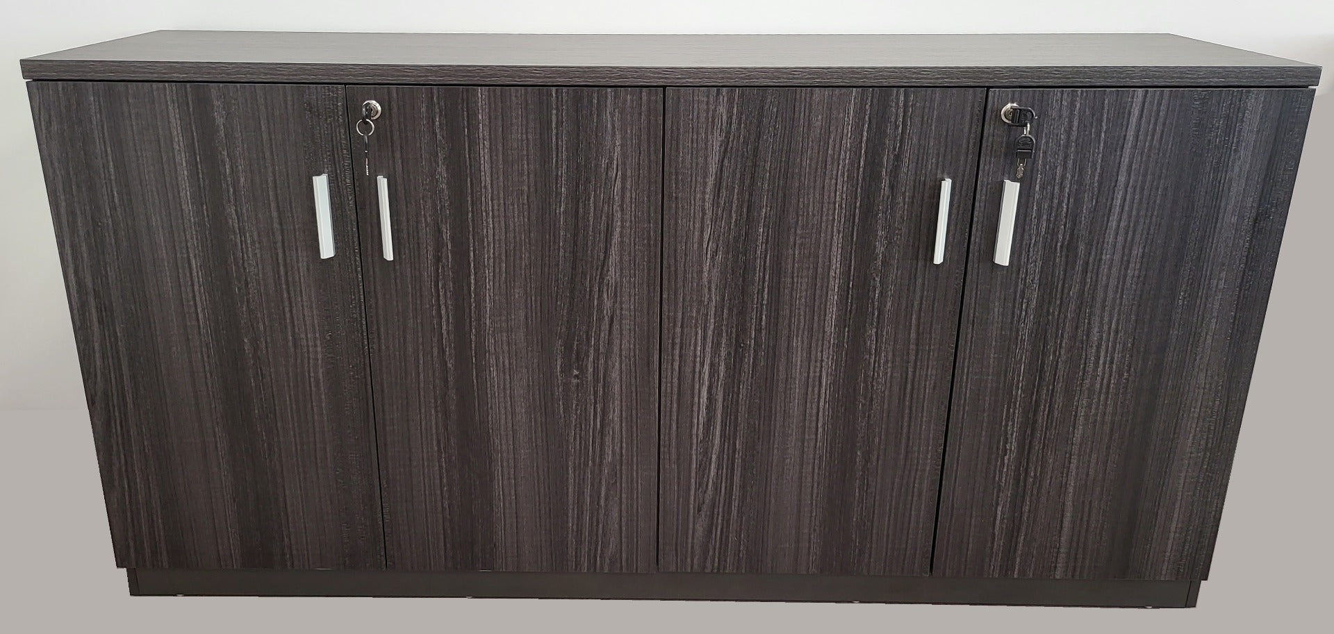 The LX-6846T-4DR has a modern design with silver handles and is finished in Grey Oak. This 1600mm wide cupboard features two double doors with locking capabilities. Each lock comes with a set of two keys. Behind these doors, is a height-adjustable shelving, which is adjustable to preset heights with removable pegs.