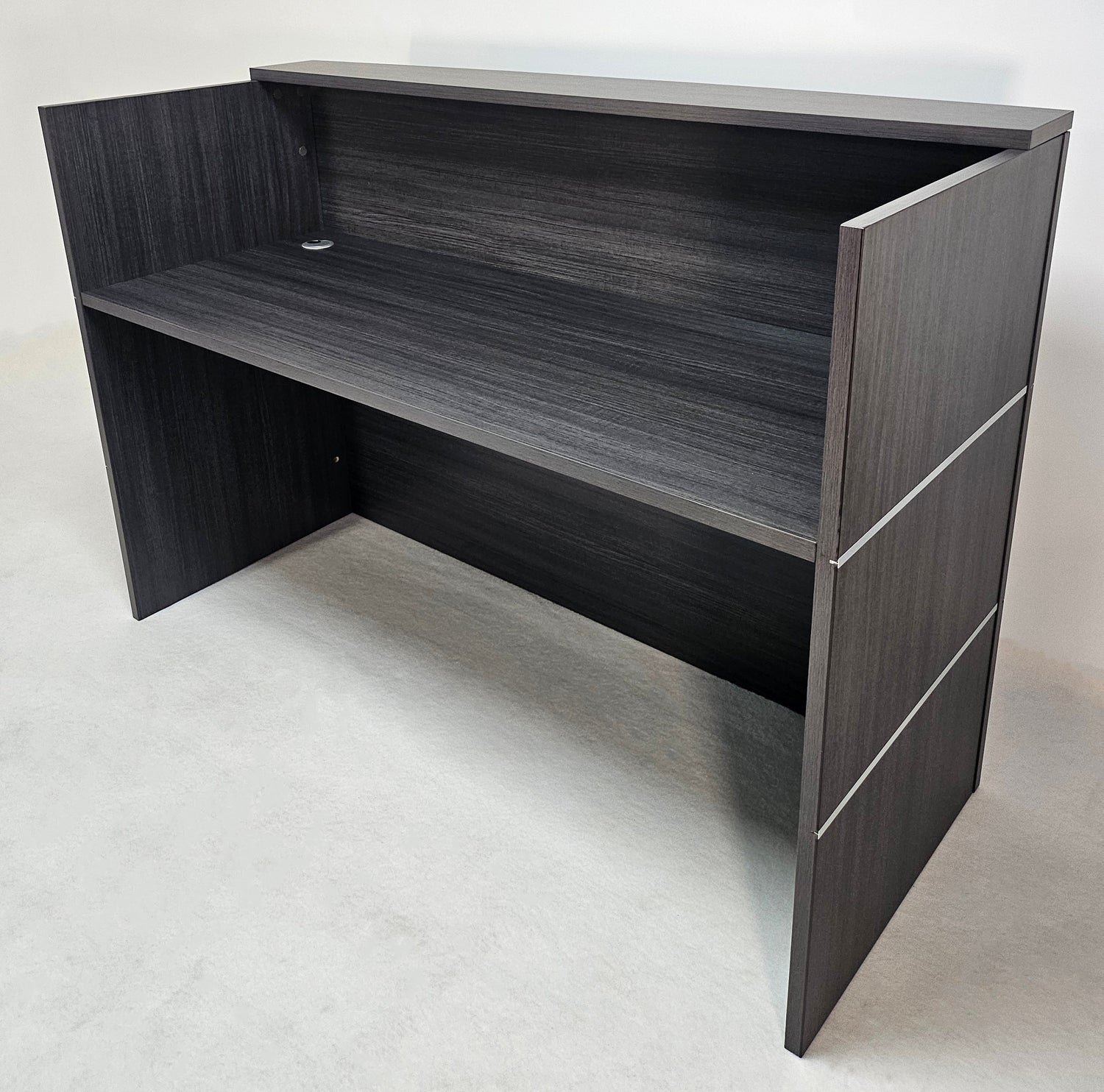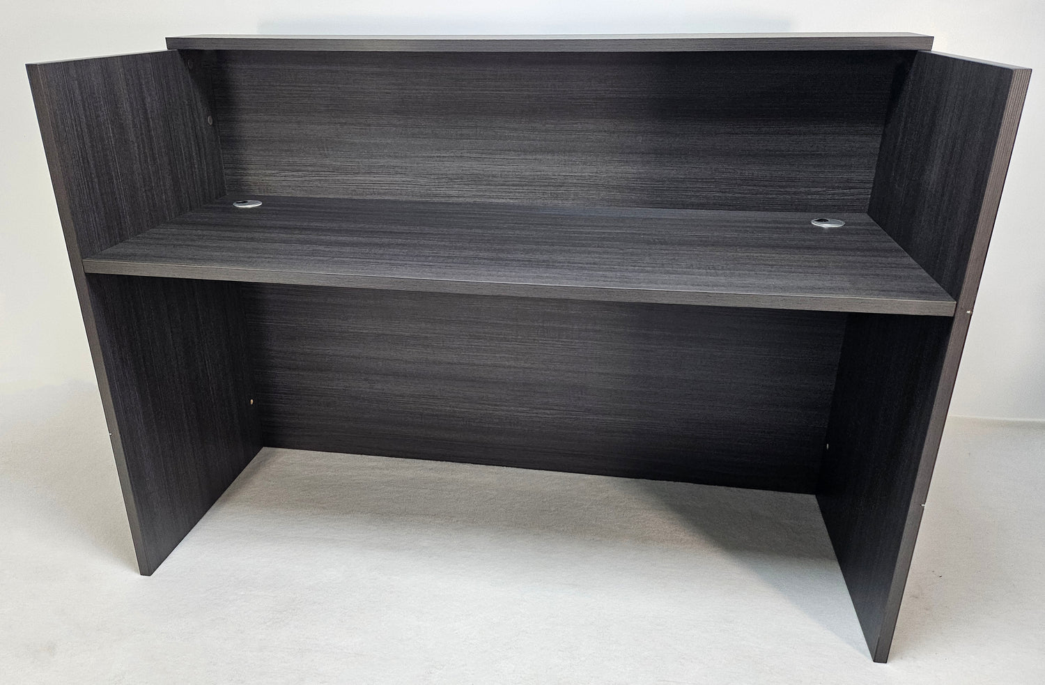 The REC-16-DG04 is a high quality counter style reception desk in a durable MFC grey oak with a chrome decorative strip finish. Designed to seat two operators with separate integrated cable management ports leading to each position. The desk features an integrated hutch section to keep monitors private with shelving built into the hutch.