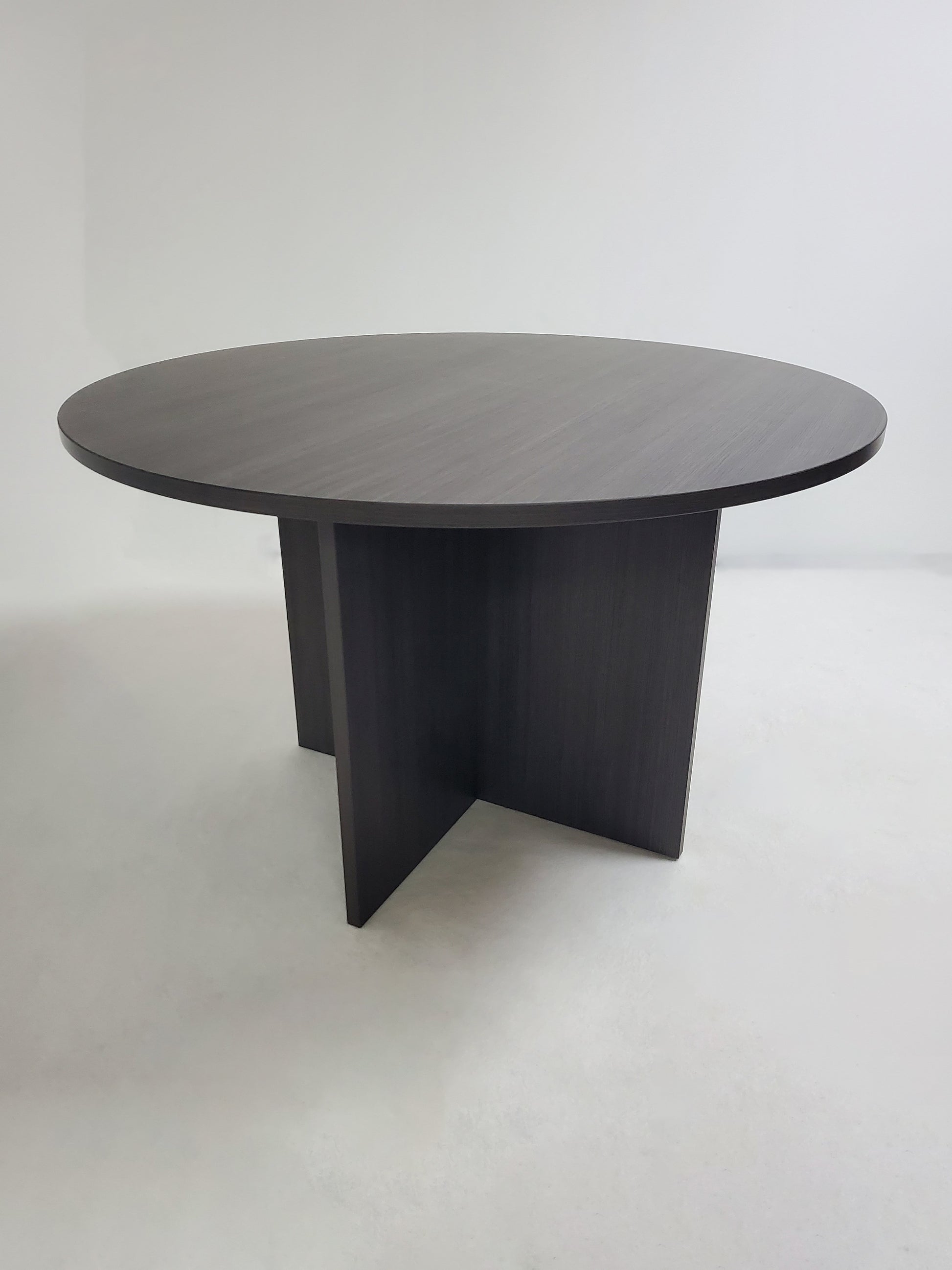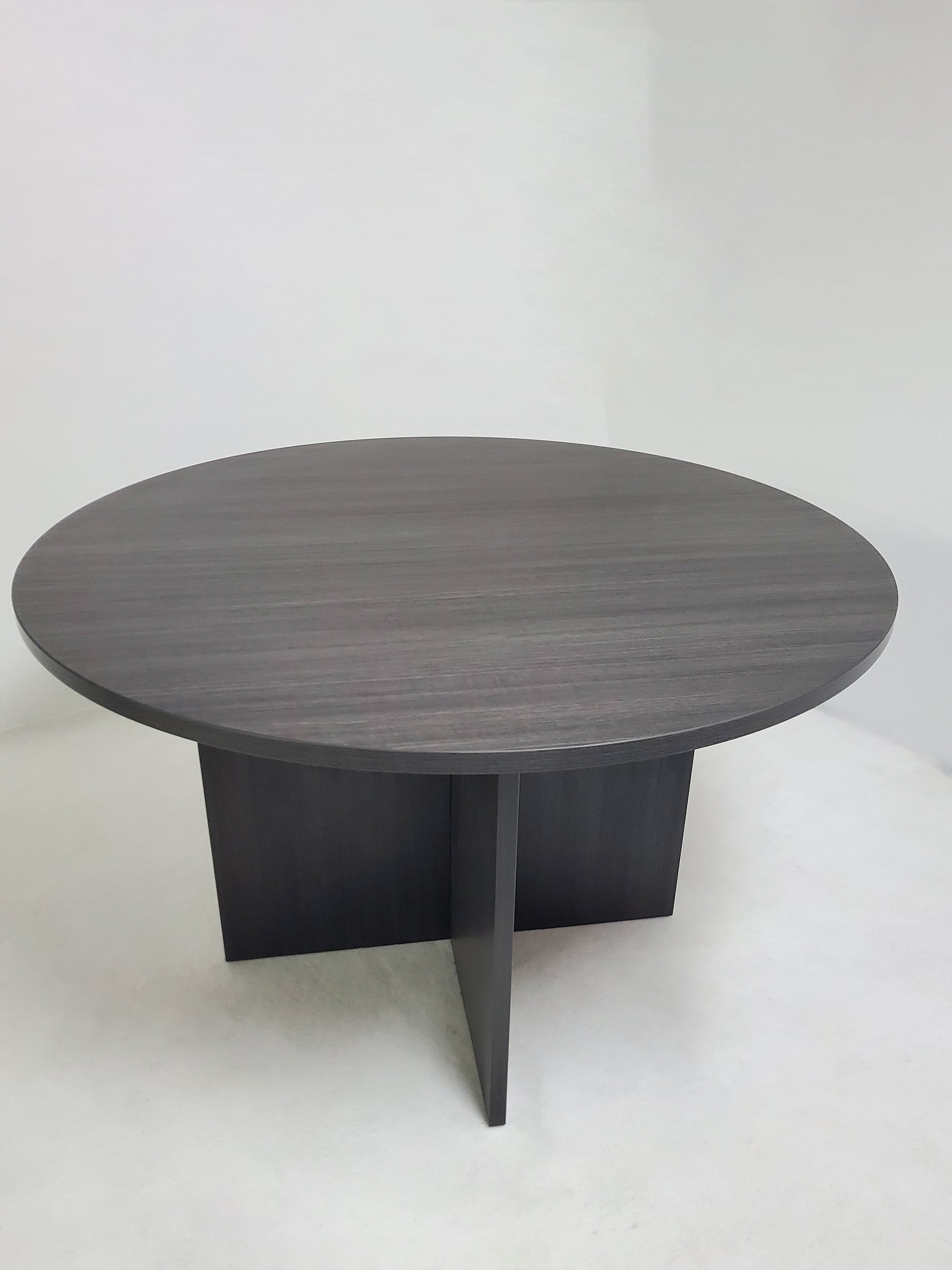 The DG04-1200 is a round meeting table with an arrowhead leg design. This meeting table has been finished in our high-quality grey oak melamine.