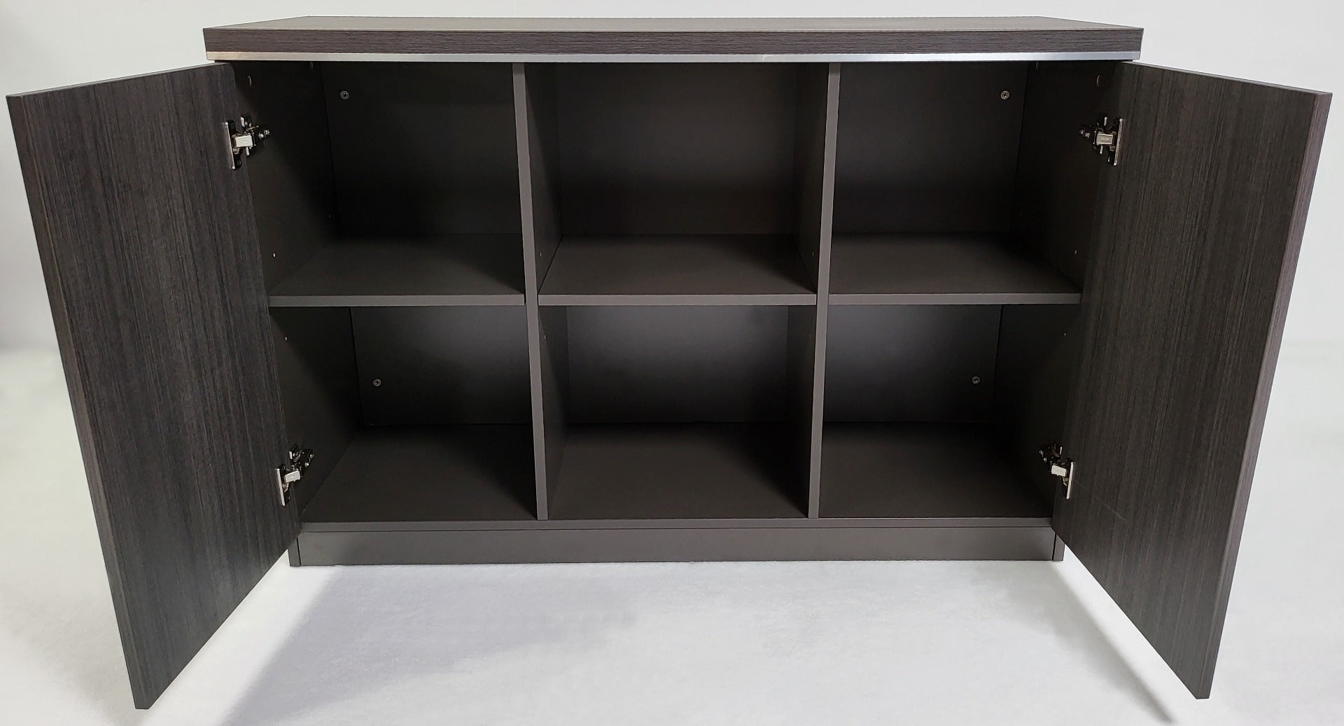 The DG07-S0312 has a modern design finished in grey oak. This 1200mm wide cupboard features two doors at either end concealing height adjustable shelving. Which is adjustable to preset heights with removable pegs. In the centre of this unit, you'll find an open shelving unit which is also adjustable, as mentioned above. This cupboard has an aluminium edging which ties into the modern theme.