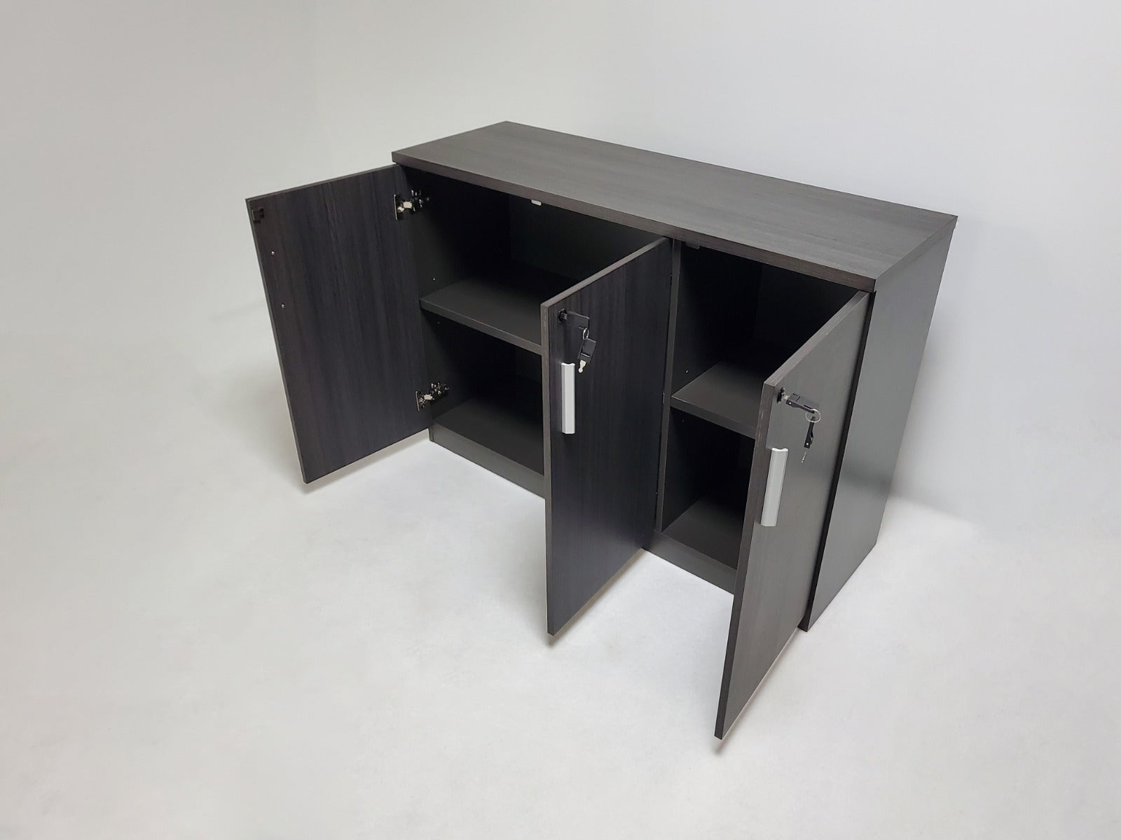 The S0616-3DR has a modern design finished in grey oak. This 1200mm wide cupboard features one set of double doors and one singular door with locking capabilities. Each lock comes with a set of two keys. Behind these doors, is a height-adjustable shelving, which is adjustable to preset heights with removable pegs.