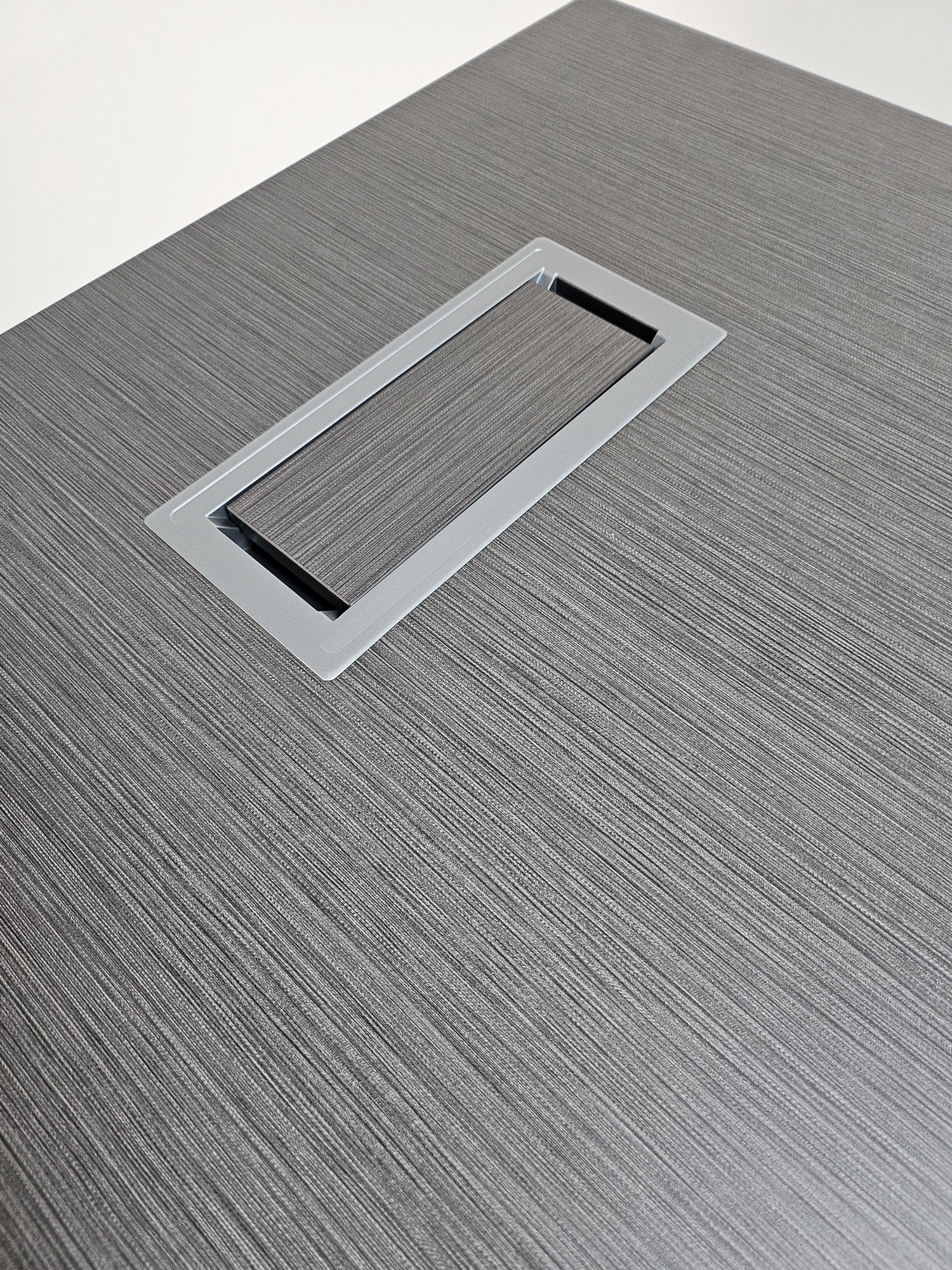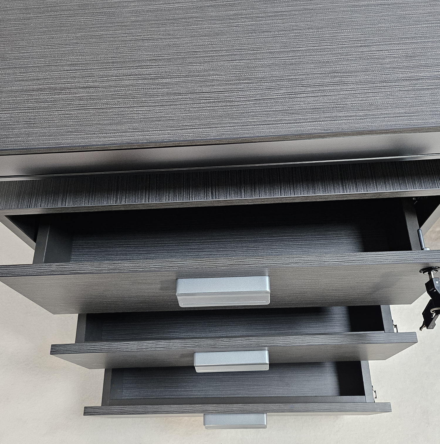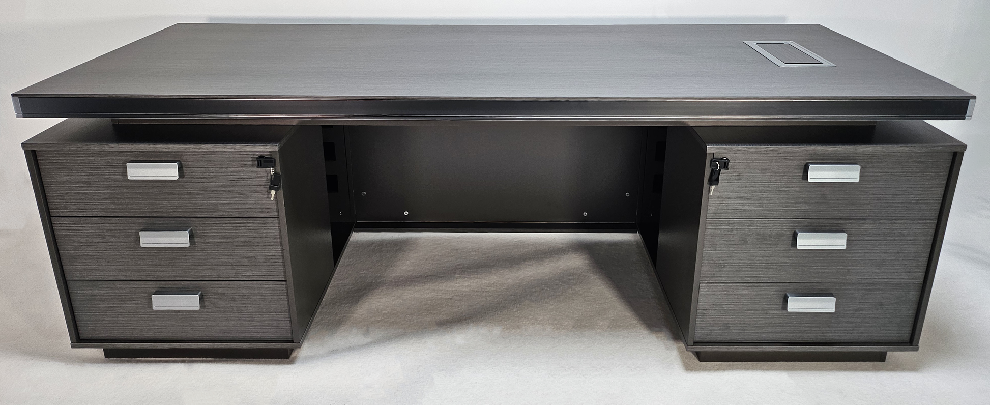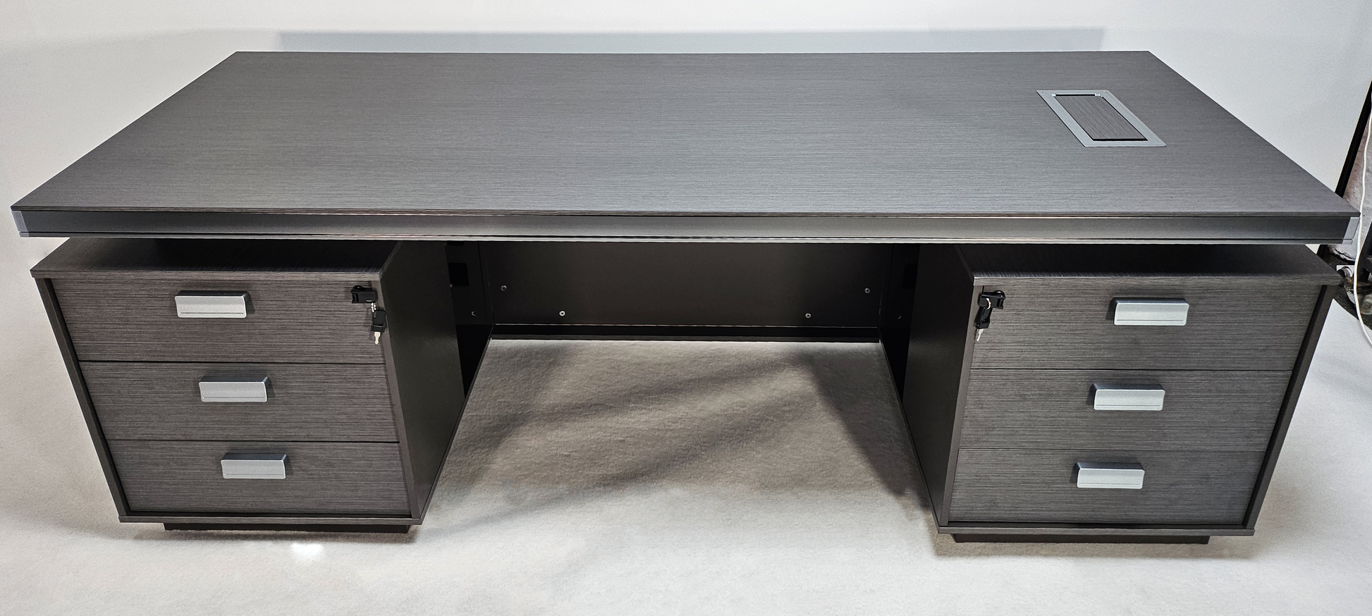 The WKO-FL-S-D04 office desk has been finished in premium high-quality grey oak, ideal for home or commercial use. This executive office desk has a modern aluminium edge which wraps around the whole desktop. The modesty panel features a stylish chrome strip along with a grey leather inset design. The rear of the desk features useful integrated storage compartments. Each pedestal features a three-lockable drawer to the front and a large open compartment to the rear.